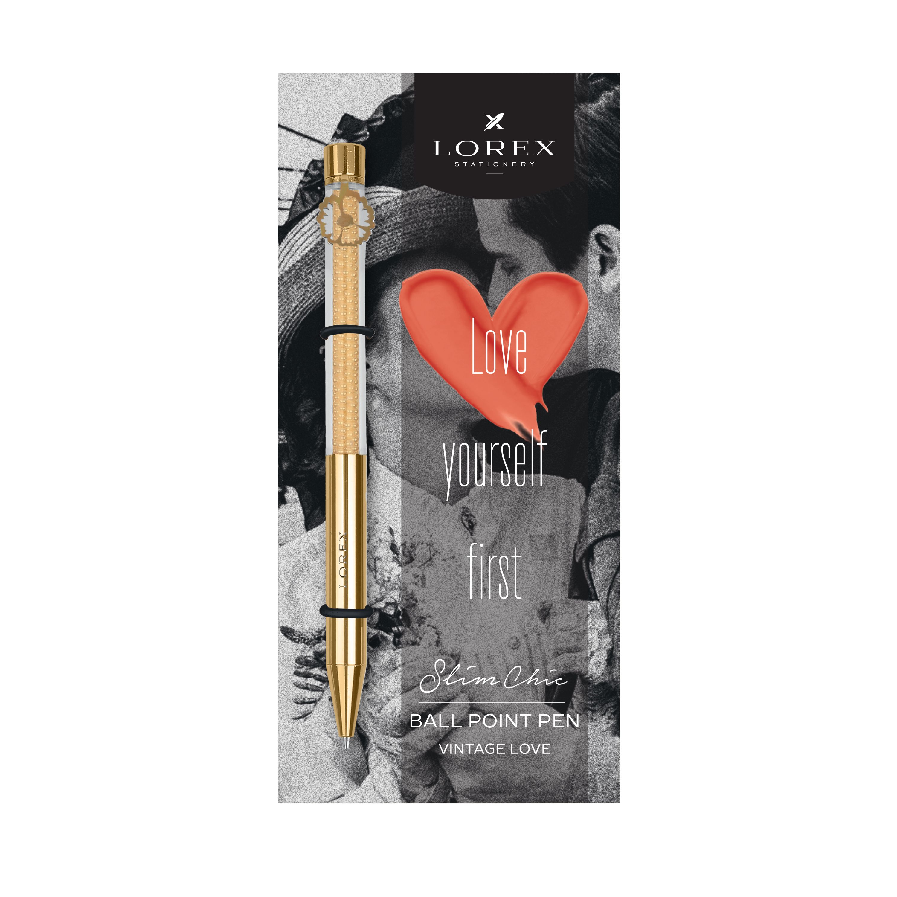 Цвет чернил: синий Механизм автоматической ручки: поворотный Толщина линии письма, мм: 0,35 Цвет корпуса: ассорти Длина стержня, мм: 57 Пишущий узел, мм: 0,70 Мин. партия и варианты упаковок: 1 / 24 / 96 Ручка шариковая подарочная LOREX Slim Chic Vintage Love синий 0,7 мм, корпус металл ассорти