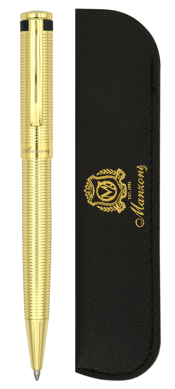 Элегантная ручка Manzoni Arezzo изготовлена из качественных материалов и обладает металлическим корпусом. Премиальный золотой цвет корпуса, украшенный черной деталью, придает ручке изысканный стиль и неповторимый шарм.