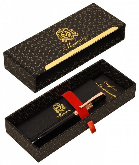 Элегантная ручка Manzoni Modena изготовлена из качественных материалов и обладает металлическим корпусом. Черный глянцевый цвет корпуса, украшенный деталями цвета розового золота, придает ручке изысканный стиль и неповторимый шарм.
