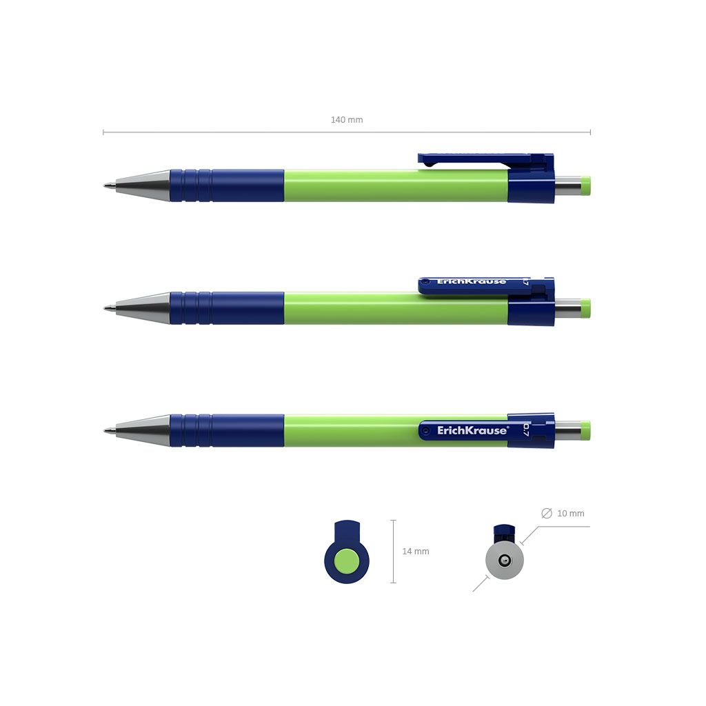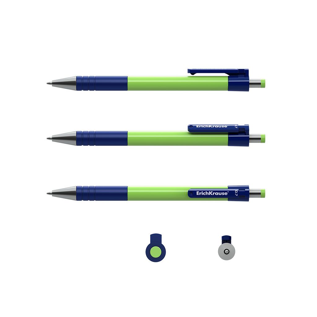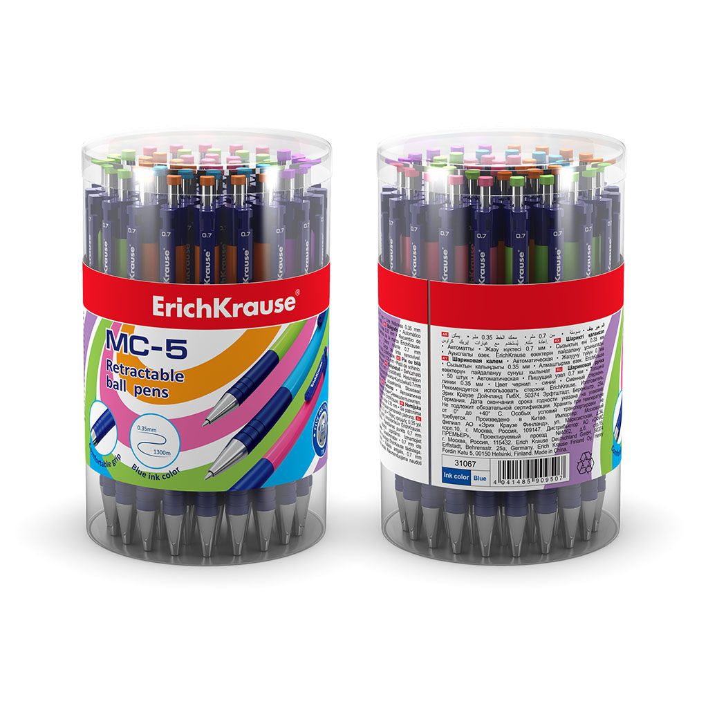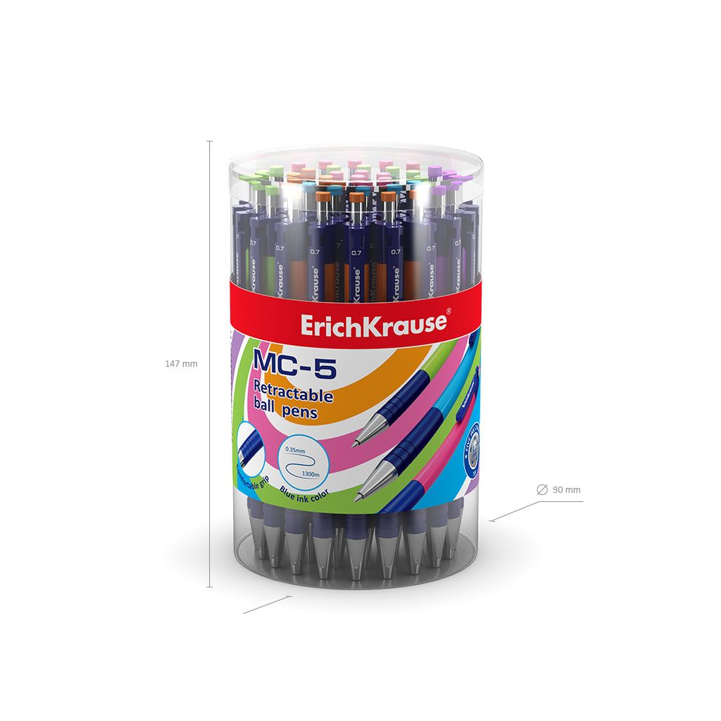 Диаметр, мм: 10 Цвет чернил: синий Количество цветов: 1 Механизм автоматической ручки: кнопочный Толщина линии письма, мм: 0,35 Цвет корпуса: ассорти Мин. партия и варианты упаковок: 1 / 50 / 150 / 1500 Ручка шариковая автоматическая ErichKrause MC-5 синяя 0,7 мм, круглый корпус, грип
