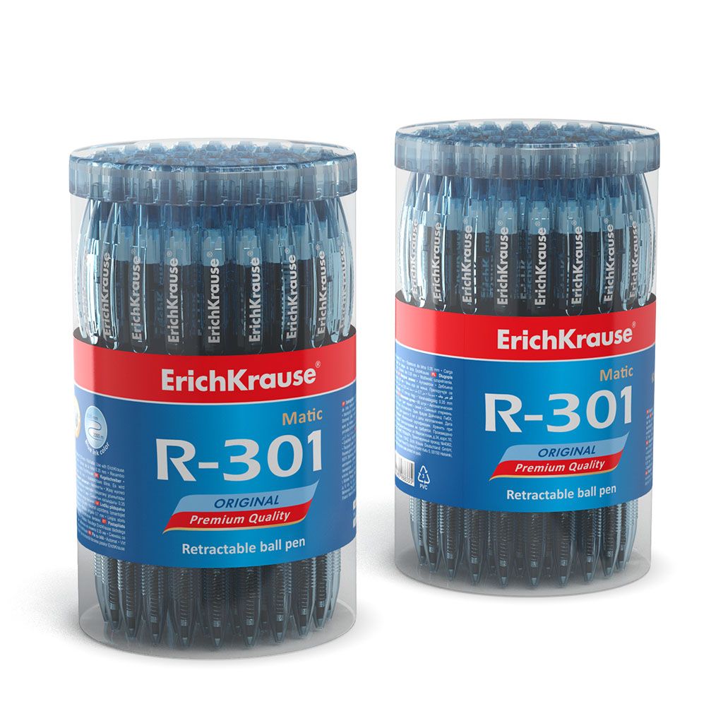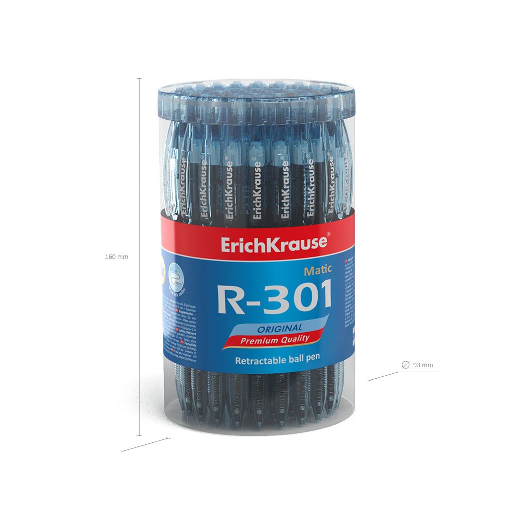Диаметр, мм: 8 Цвет чернил: синий Количество цветов: 1 Механизм автоматической ручки: кнопочный Толщина линии письма, мм: 0,35 Цвет корпуса: синий Мин. партия и варианты упаковок: 1 / 60 / 2160 Ручка шариковая автоматическая ErichKrause Original Matic R-301 синяя 0,7 мм, круглый корпус