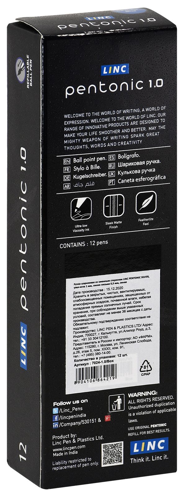 Цвет чернил: черный Толщина линии письма, мм: 0,35 Цвет корпуса: серый Наличие резинового грипа: Нет Упаковка: картонная коробка Профиль корпуса: круглый корпус Мин. партия и варианты упаковок: 1 / 10 / 100 / 1200 Ручка шариковая Linc PENTONIC FROST черная 0,7 мм, серый круглый корпус, игольчатый наконечник