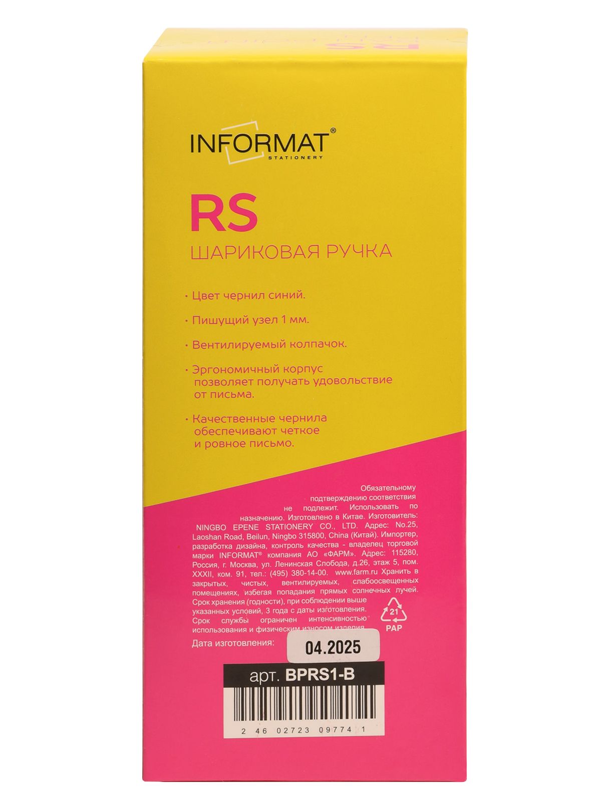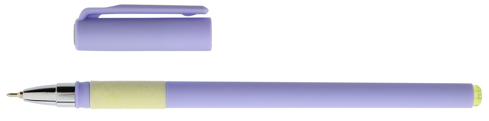 Цвет чернил: синий Толщина линии письма, мм: 0,50 Цвет корпуса: фиолетовый Наличие резинового грипа: Нет Упаковка: картонная коробка Профиль корпуса: круглый корпус Мин. партия и варианты упаковок: 1 / 12 / 360 -