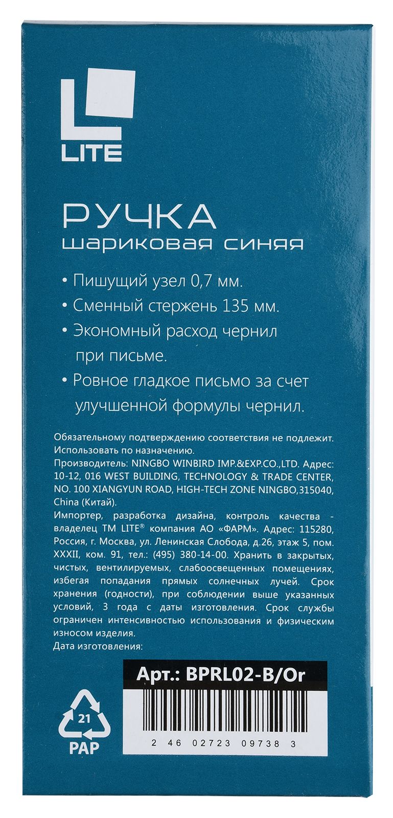 Цвет чернил: синий Толщина линии письма, мм: 0,32 Цвет корпуса: синий Наличие резинового грипа: Нет Упаковка: картонная коробка Профиль корпуса: круглый корпус Мин. партия и варианты упаковок: 1 / 30 / 120 -