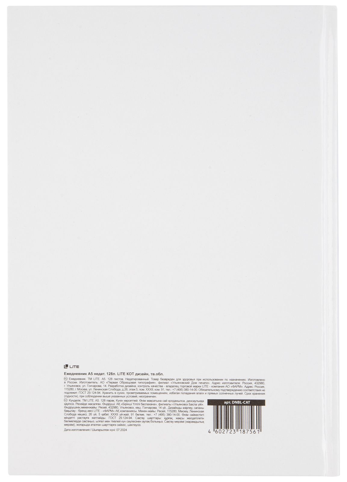 Формат: А5 Количество листов: 128 Материал обложки: картон Линовка: линия Вид изделия: Ежедневник Степень датированности: недатированный Мин. партия и варианты упаковок: 1 / 20 Ежедневник А5 недатированный LITE КОТ 128 л. с дизайном, твердая обложка картон, глянцевая ламинация