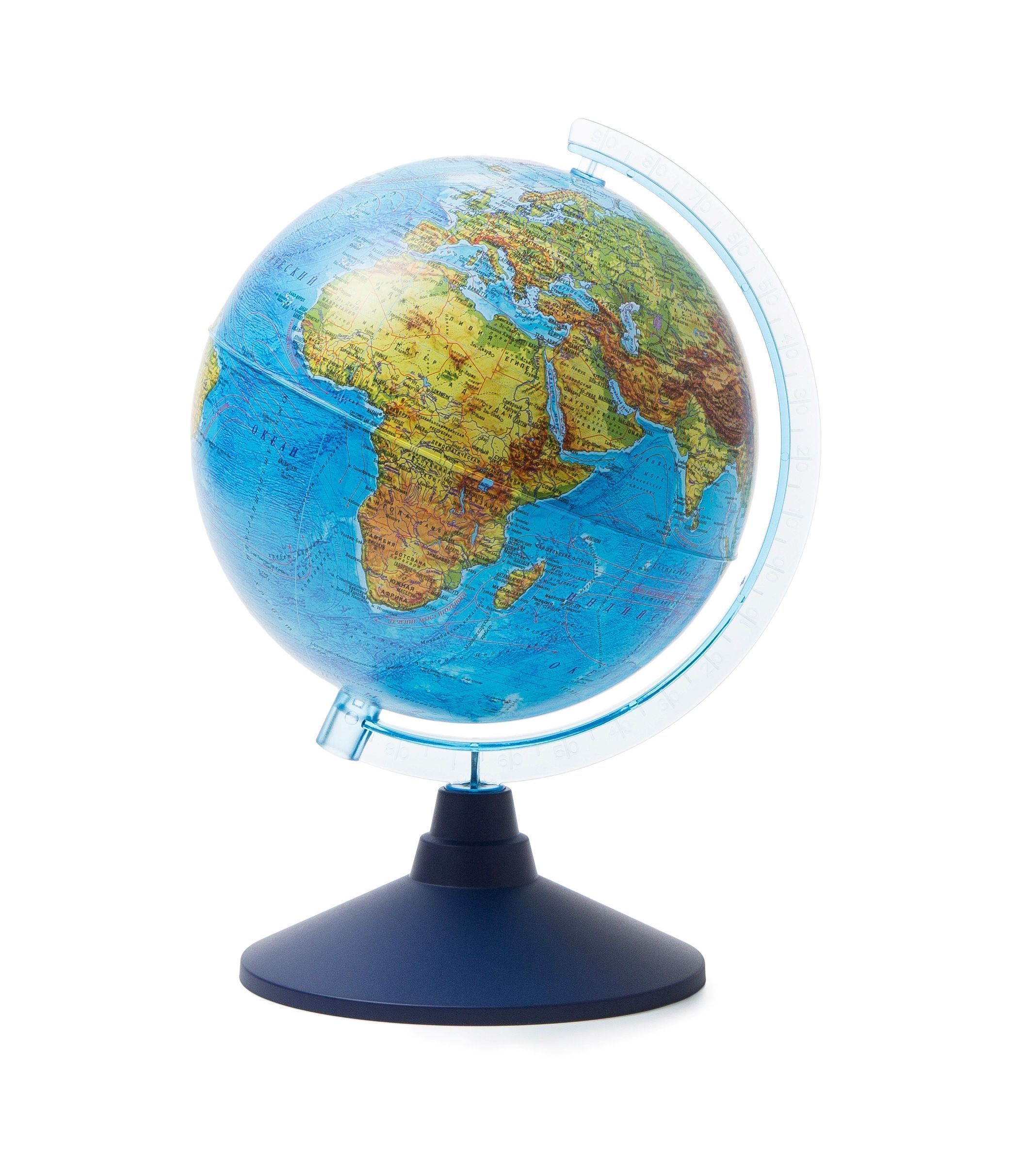 Классический физический глобус для изучения географии детям от 5-ти лет. Сфера изготовлена из пластика. Диаметр сферы 21 см. Устойчивая настольная подставка из синего пластика. Карта максимально подробная для данного диаметра глобуса. Линия экватора выпуклая для тактильно восприятия. Карта физическая, отражает ландшафт нашей планеты. Изображение карты соответствует принятым мировым картографическим стандартам условного обозначения ландшафта и стран.