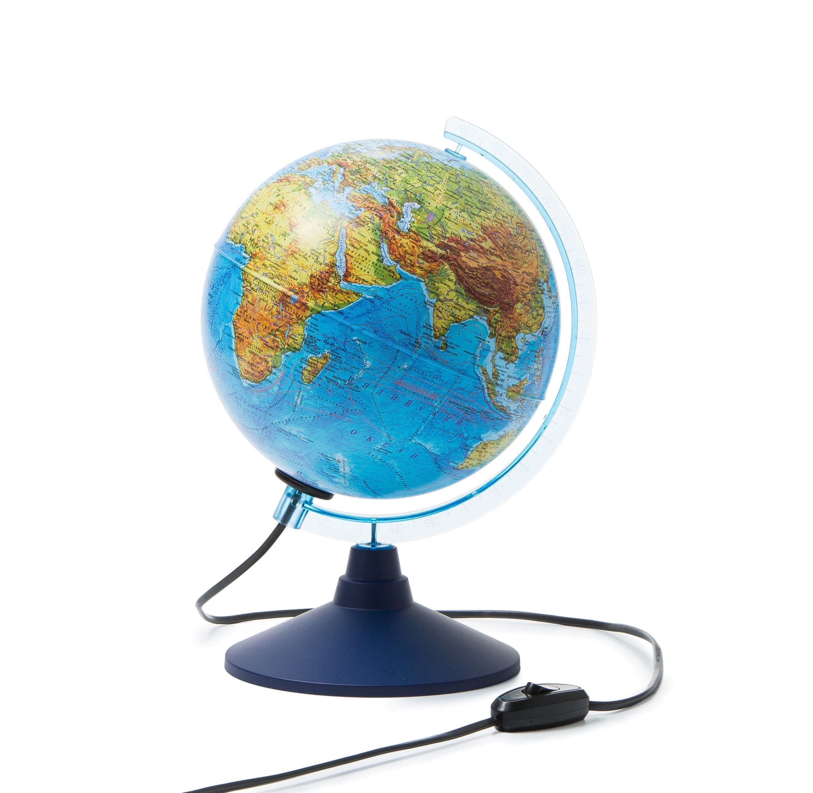 Глобус с двойной картой для тех, кто интересуется географией и политическим устройством нашего мира. Сфера изготовлена из пластика. Диаметр сферы 21 см. Устойчивая настольная подставка из синего пластика. Карта максимально подробная для данного диаметра глобуса. Линия экватора выпуклая для тактильно восприятия. Карта двойная. При включении в сеть проступает политическая карта. Изображение карты соответствует принятым мировым картографическим стандартам условного обозначения ландшафта и стран. Лампа подсветки съемная, цоколь Е14.