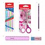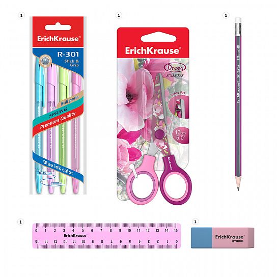 | Комплектация набора: | 4 ручки, карандаш, линейка, ластик, ножницы |