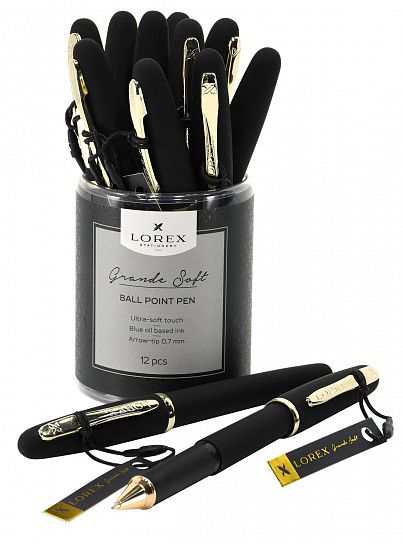 Цвет чернил: синий Толщина линии письма, мм: 0,35 Цвет корпуса: черный Длина стержня, мм: 111 Пишущий узел, мм: 0,70 Модель: Grande Soft Мин. партия и варианты упаковок: 1 / 12 / 144 / 576 Ручка масляная LOREX черный корпус, Grande Soft синяя, конусовидный наконечник, 0,7 мм