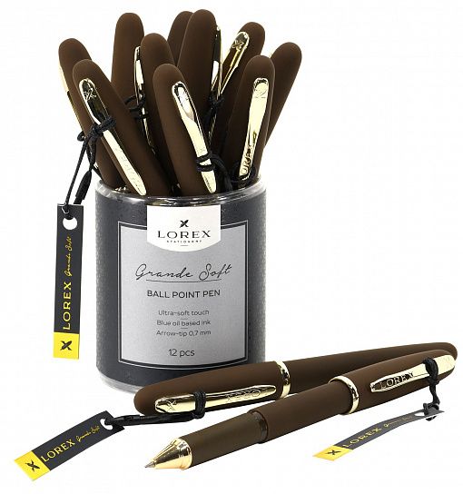 Цвет чернил: синий Толщина линии письма, мм: 0,35 Цвет корпуса: коричневый Длина стержня, мм: 111 Пишущий узел, мм: 0,70 Модель: Grande Soft Мин. партия и варианты упаковок: 1 / 12 / 144 / 576 Ручка масляная LOREX коричневый корпус, Grande Soft синяя, конусовидный наконечник, 0,7 мм