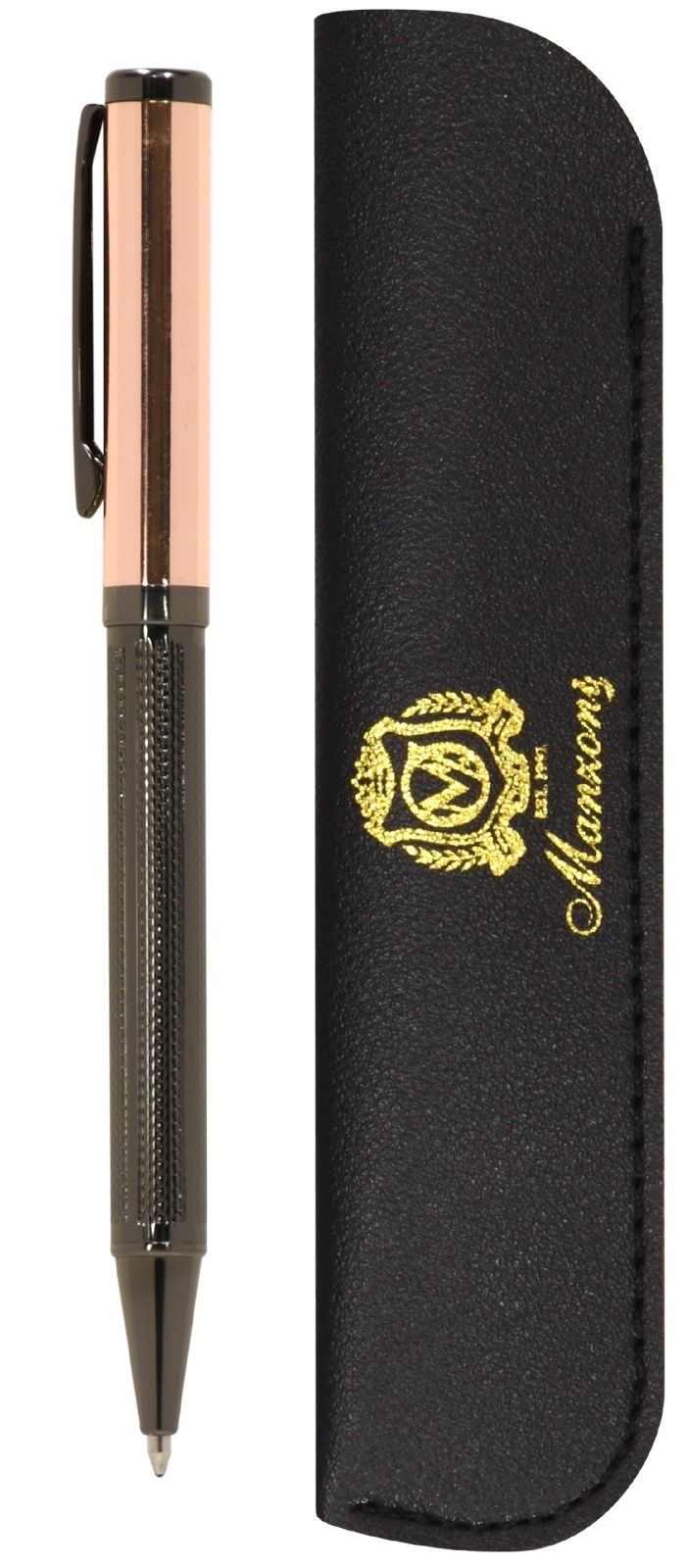 Цвет чернил: синий Механизм автоматической ручки: поворотный Толщина линии письма, мм: 0,50 Цвет корпуса: черный Длина стержня, мм: 98 Пишущий узел, мм: 1,00 Мин. партия и варианты упаковок: 1 / 25 / 50 Ручка шариковая подарочная Manzoni Modena синяя 1 мм, корпус металл черный, розовое золото, футляр soft touch выдвижной