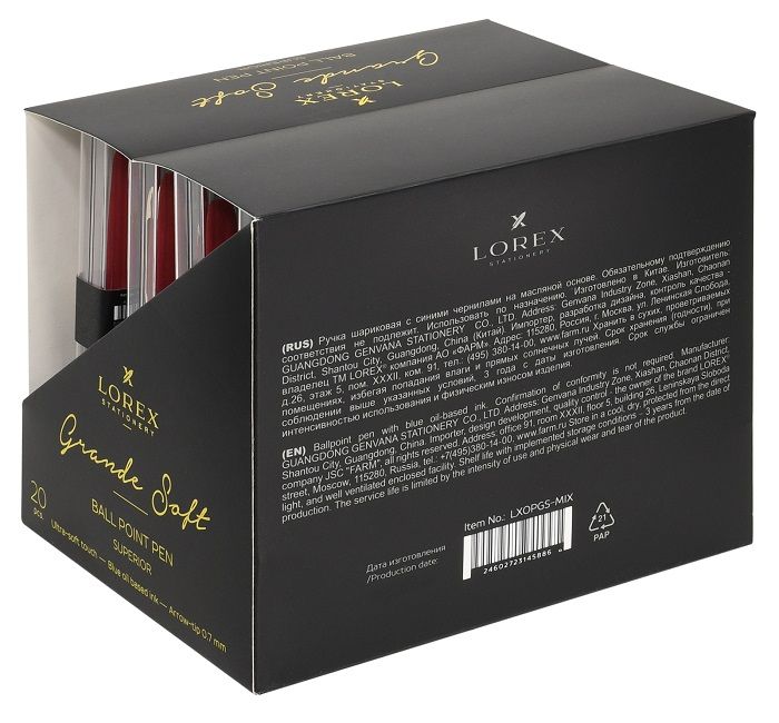 Цвет чернил: синий Механизм автоматической ручки: отсутствует Толщина линии письма, мм: 0,35 Цвет корпуса: ассорти Длина стержня, мм: 111 Пишущий узел, мм: 0,70 Мин. партия и варианты упаковок: 1 / 20 / 240 Ручка шариковая LOREX Grande Soft, чернила на масляной основе, прорезиненный корпус, золотые детали, резиновый грип, синие чернила, с золотой фольгой