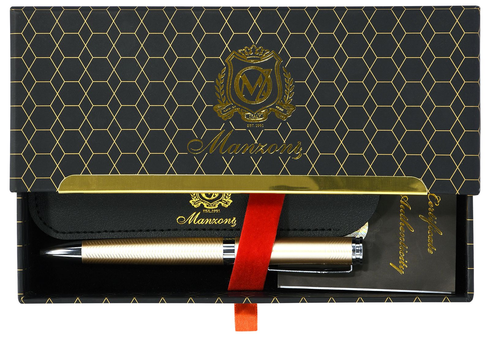 Цвет чернил: синий Механизм автоматической ручки: поворотный Толщина линии письма, мм: 0,50 Цвет корпуса: золотой Длина стержня, мм: 98 Пишущий узел, мм: 1,00 Мин. партия и варианты упаковок: 1 / 25 / 50 Ручка шариковая подарочная Manzoni Arezzo синяя 1 мм, корпус металл золото, черный, футляр soft touch выдвижной