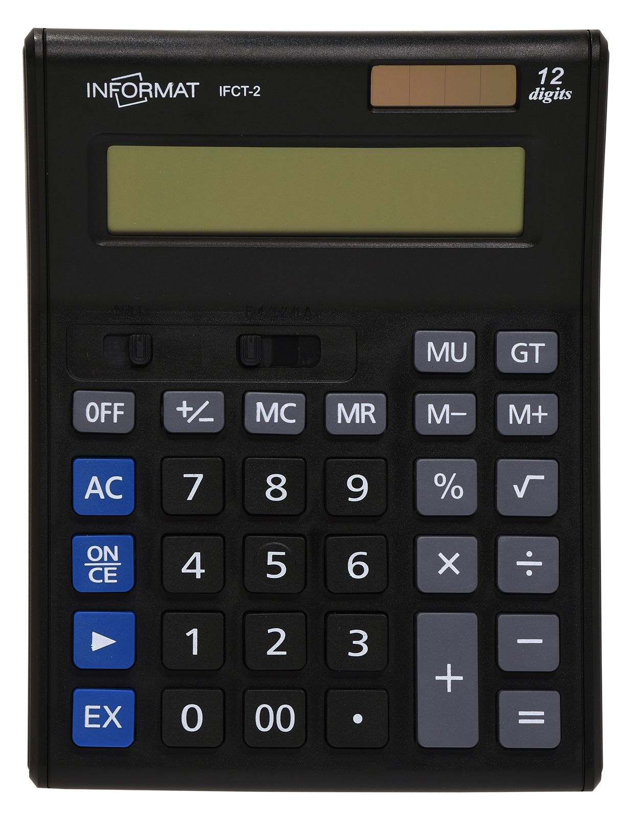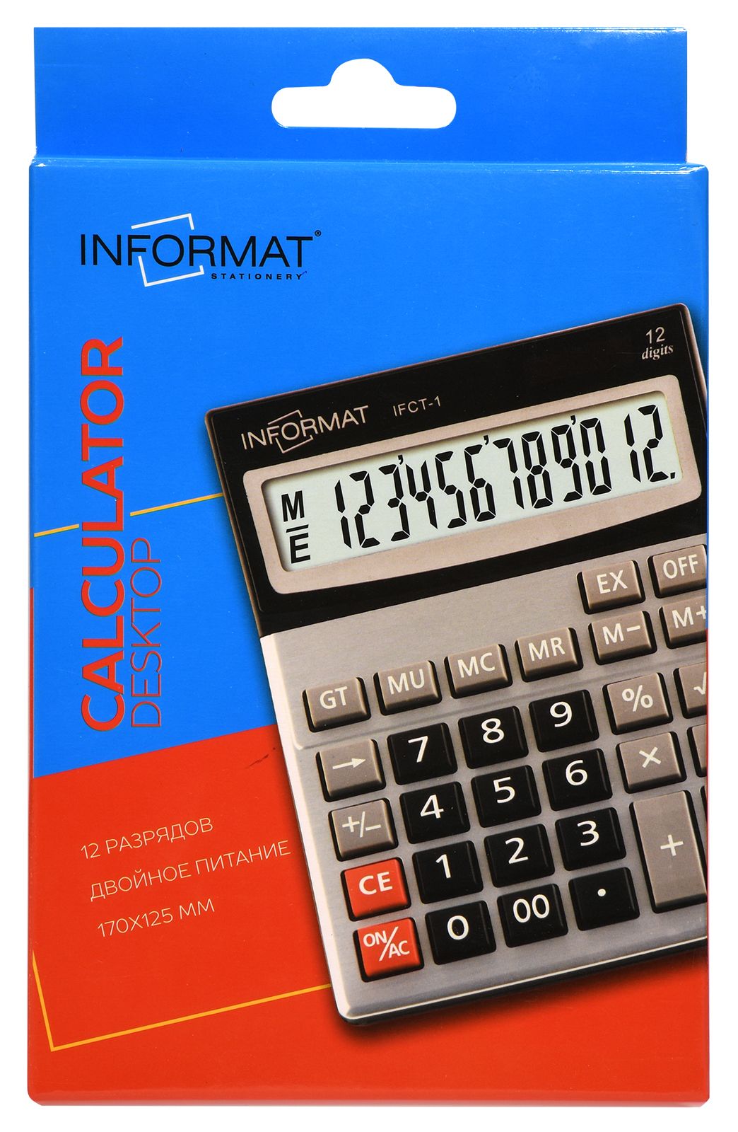Цвет: серебристый/черный Назначение калькулятора: настольный Разрядность калькулятора: 12 Вид офисной техники: Калькулятор Упаковка: картонная упаковка Наличие крышки: Нет Мин. партия и варианты упаковок: 1 / 30 / 90 Калькулятор INFORMAT IFCT-1 12 разрядный, настольный, серебристый/черный