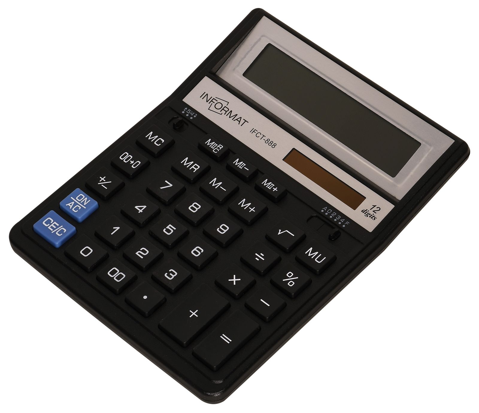 Цвет: серебристый/черный Назначение калькулятора: настольный Разрядность калькулятора: 12 Вид офисной техники: Калькулятор Упаковка: картонная упаковка Наличие крышки: Нет Мин. партия и варианты упаковок: 1 / 30 / 90 Калькулятор INFORMAT IFCT-888 12 разрядный, настольный, серебристый/черный