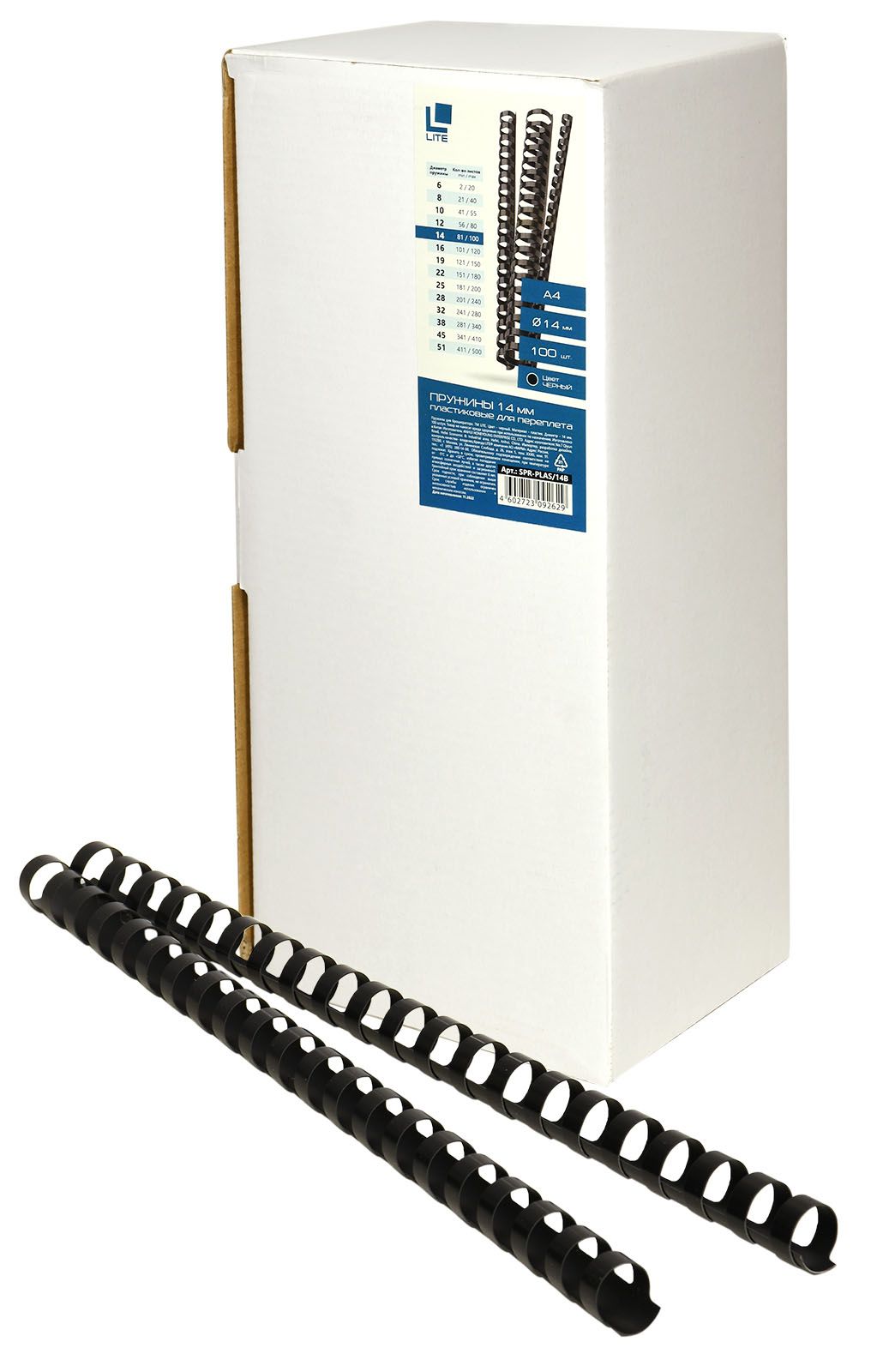 Цвет: черный Диаметр, мм: 14 Формат: А4 Материал: пластик Торговая марка: LITE Количество штук в упаковке: 100 шт/упак Мин. партия и варианты упаковок: 1 / 10 Пружина для переплета LITE 14 мм пластик А4 черн. 100 шт/упак