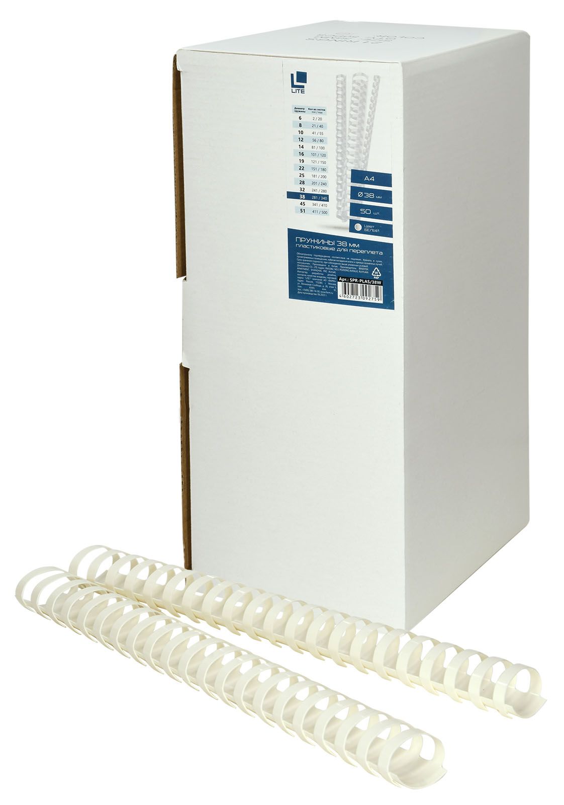 Цвет: белый Диаметр, мм: 38 Формат: А4 Материал: пластик Торговая марка: LITE Количество штук в упаковке: 50 шт/упак Мин. партия и варианты упаковок: 1 / 10 Пружина для переплета LITE 38 мм пластик А4 белый 50 шт/упак