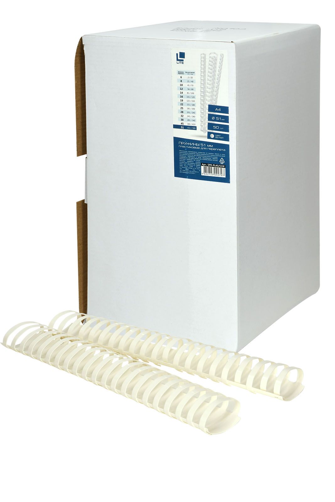 Цвет: белый Диаметр, мм: 51 Формат: А4 Материал: пластик Торговая марка: LITE Количество штук в упаковке: 50 шт/упак Мин. партия и варианты упаковок: 1 / 10 Пружина для переплета LITE 51 мм пластик А4 белый 50 шт/упак