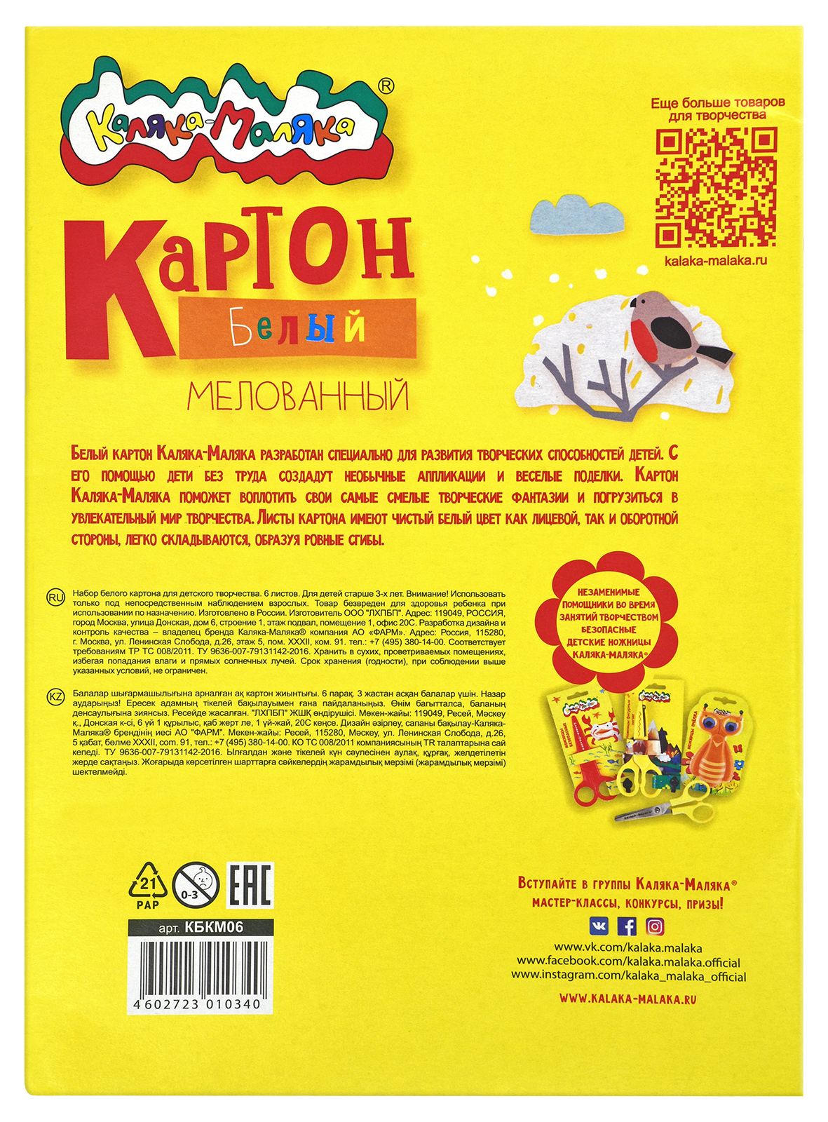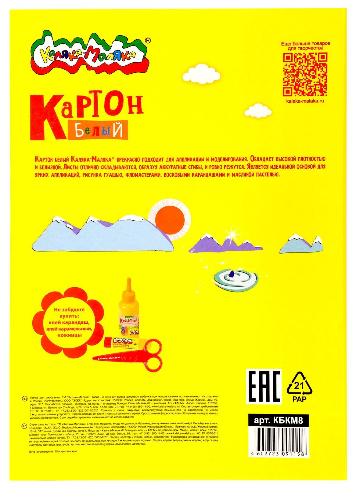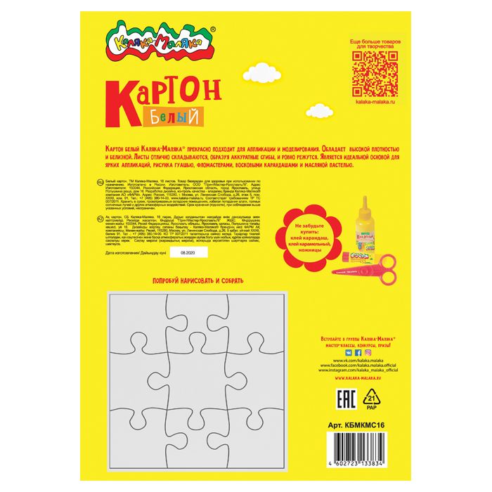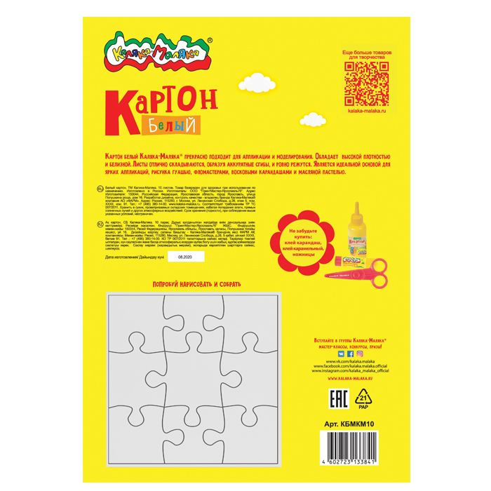 Формат: А4 Плотность, г/м2: 200 Количество листов: 6 Наличие европодвеса: Нет Упаковка: картонная папка Тип скрепления: нет Мин. партия и варианты упаковок: 1 / 70 Картон белый Каляка-Маляка 6 листов, мелованный А4 209х296 мм 200 г/м2