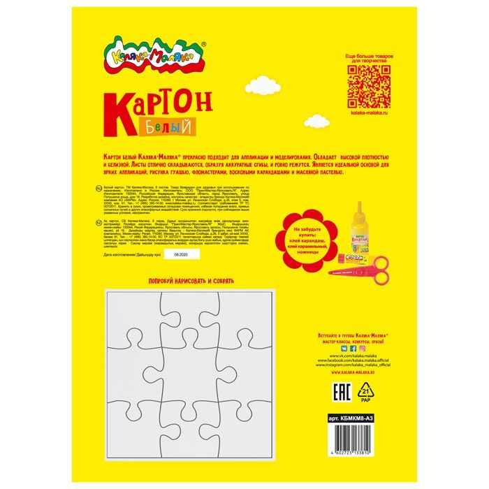 Формат: А4 Плотность, г/м2: 190 Количество листов: 8 Наличие европодвеса: Нет Упаковка: картонная папка Тип скрепления: нет Мин. партия и варианты упаковок: 1 / 50 Картон белый Каляка-Маляка 8 листов, немелованный А4 199х278 мм 190 г/м2