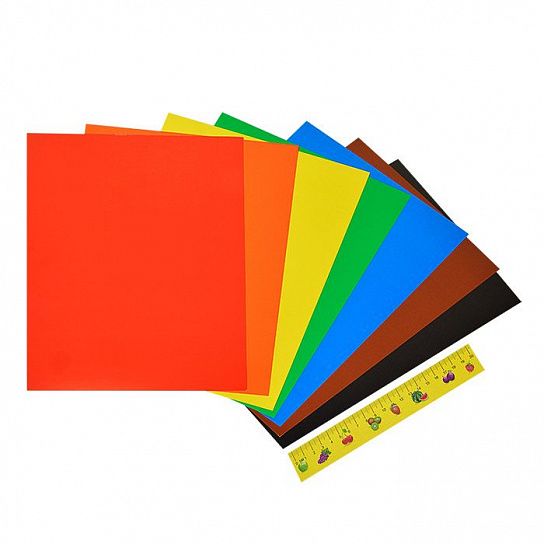 Картон представлен следующими цветами: красный, оранжевый, желтый, зеленый, коричневый, черный, голубой.