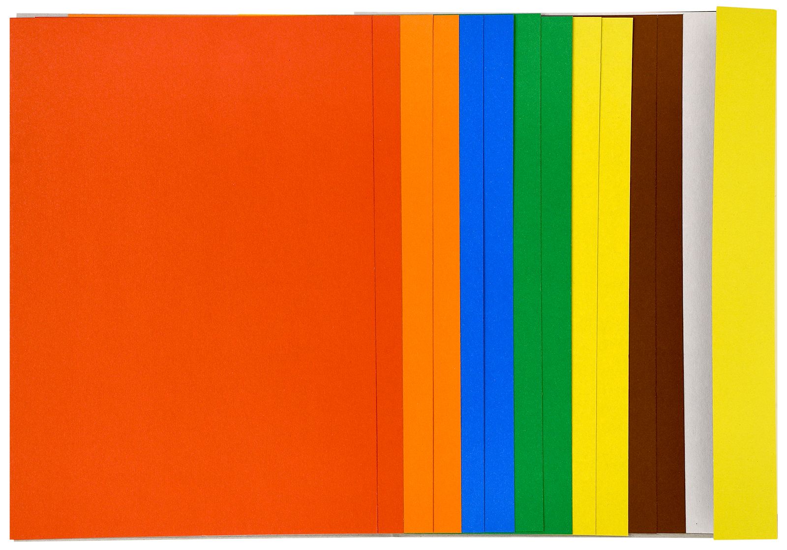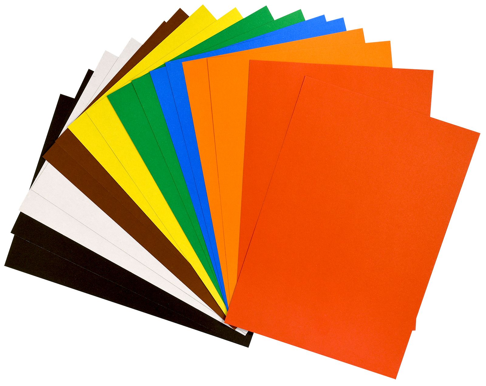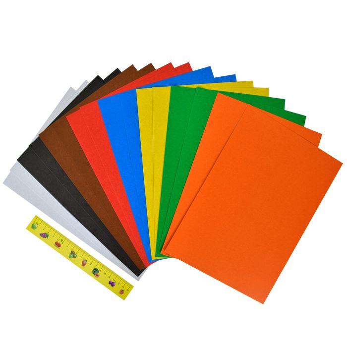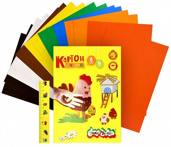 Картон представлен следующими цветами (по 2 листа каждого цвета в наборе): красный, желтый, оранжевый, коричневый, белый, синий, зеленый, черный. Обладает высоким качеством прокраски и насыщенными цветами.