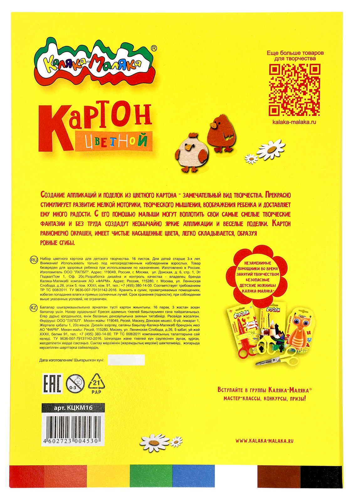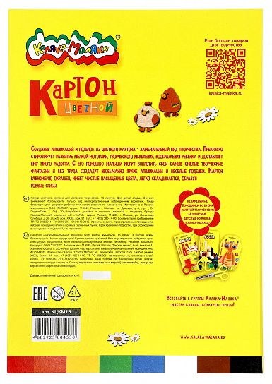 Картон цветной Каляка-Маляка® обладает высоким качеством прокраски и насыщенным цветом, хорошо складывается, образуя аккуратные сгибы, легко приклеивается.