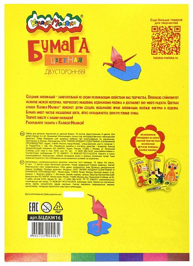 Цветная бумага необходима каждому ребенку - для аппликаций в детском саду, начальной школе и просто для домашнего творчества. Двусторонняя бумага Каляка-Маляка® прекрасно подходит для 3D аппликаций и поделок в технике оригами. Благодаря высокому качеству прокраски листы имеют насыщенные цвета, и поэтому поделки выглядят очень ярко и привлекательно.