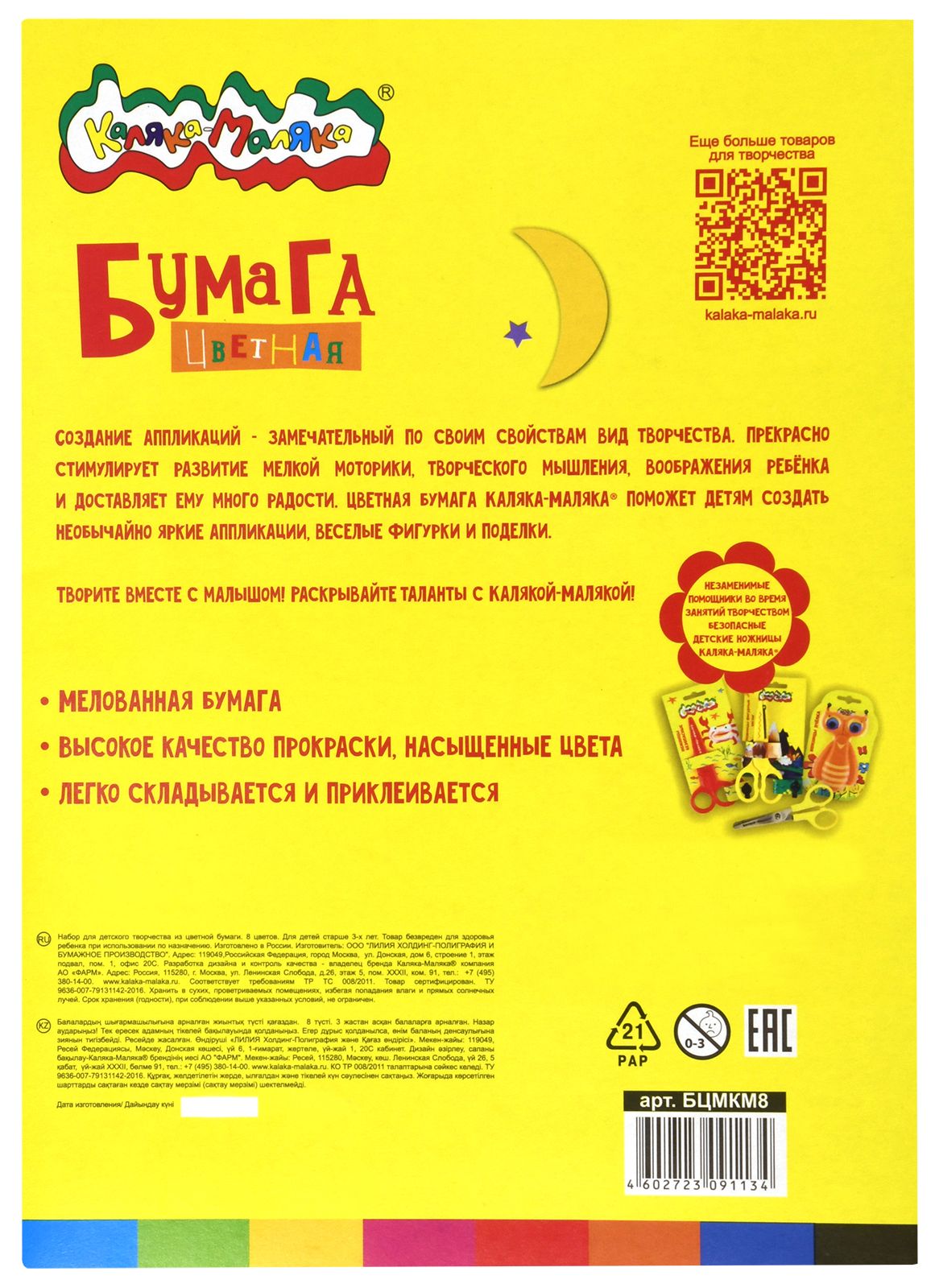Формат: А4 Плотность, г/м2: 70 Количество листов: 16 Вид продукции для творчества: Бумага цветная Количество цветов: 8 Наличие европодвеса: Нет Мин. партия и варианты упаковок: 1 / 40 Бумага цветная мелованная Каляка-Маляка А4, 8 цветов 16 листов, 70 г/м2 в папке