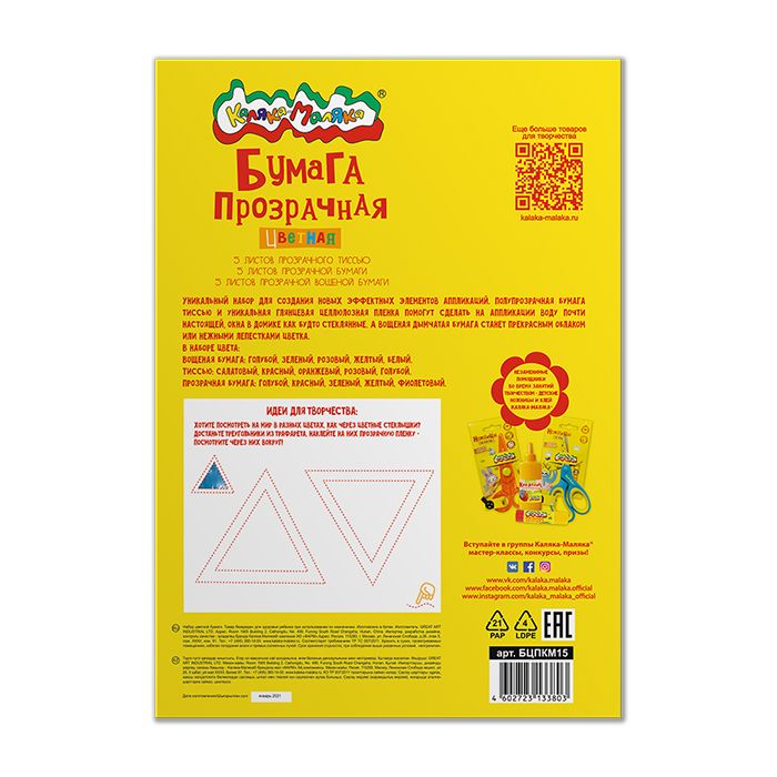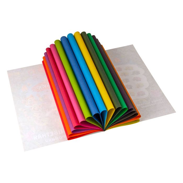 Формат: А4 Плотность, г/м2: 17 Количество листов: 15 Вид продукции для творчества: Бумага цветная Количество цветов: 15 Наличие европодвеса: Нет Мин. партия и варианты упаковок: 1 / 50 Бумага цветная прозрачная Каляка-Маляка 15 листов 15 цветов А4 210х297 мм в папке