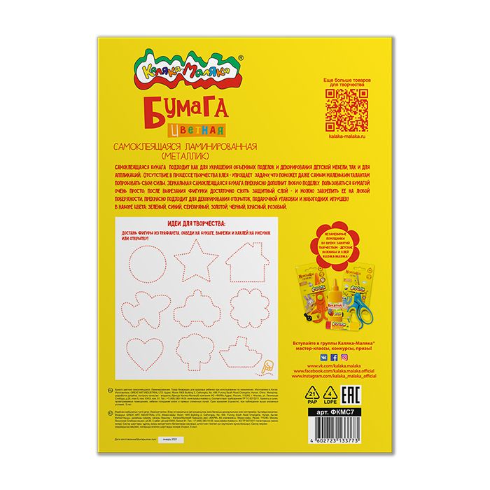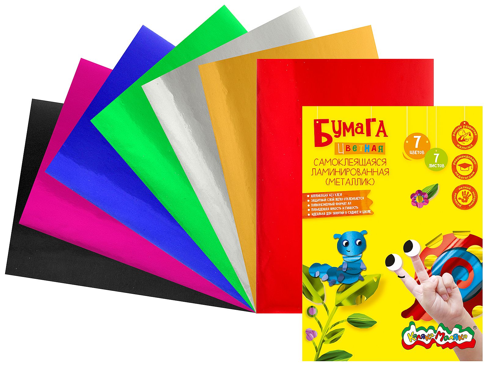 Формат: А4 Плотность, г/м2: 190 Количество листов: 7 Вид продукции для творчества: Бумага цветная Количество цветов: 7 Наличие европодвеса: Нет Мин. партия и варианты упаковок: 1 / 100 Бумага цветная самоклеящ. Каляка-Маляка ламинированная 7 листов 7 цветов А4 210х297 мм в папке