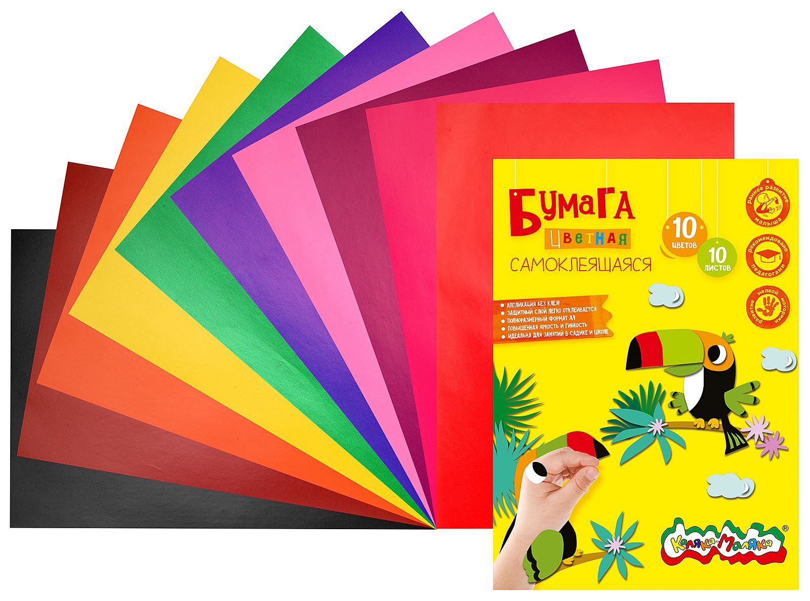 Формат: А4 Плотность, г/м2: 110 Количество листов: 10 Вид продукции для творчества: Бумага цветная Количество цветов: 10 Наличие европодвеса: Нет Мин. партия и варианты упаковок: 1 / 100 Бумага цветная Каляка-Маляка бархатная самоклеящаяся 10 листов, 10 цветов, A4 (194*285) в папке