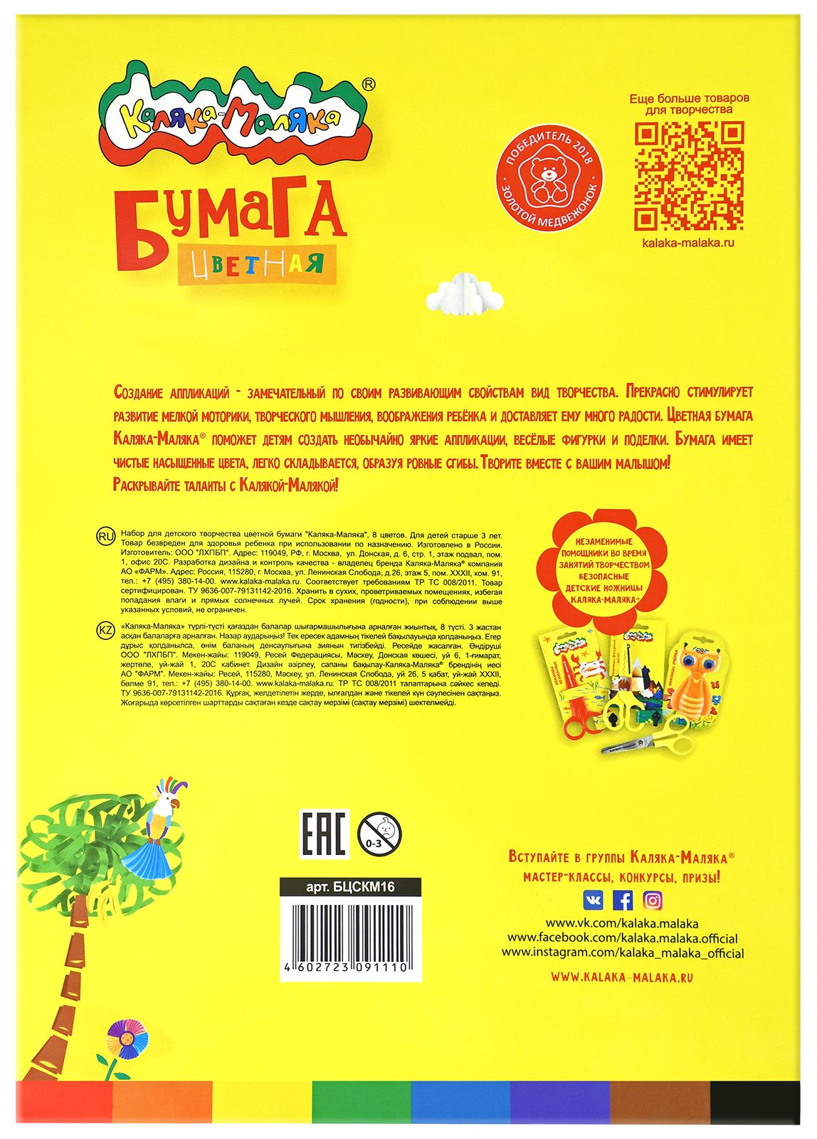 Формат: А4 Плотность, г/м2: 45 Количество листов: 18 Вид продукции для творчества: Бумага цветная Количество цветов: 18 Наличие европодвеса: Нет Мин. партия и варианты упаковок: 1 / 50 -