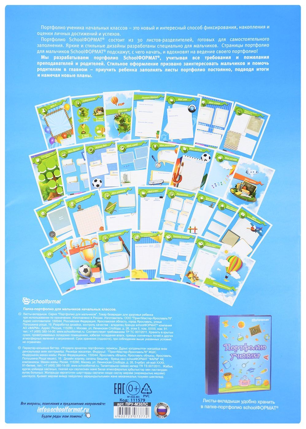 Формат: А4 Цвет: голубой Вид изделия: Листы-вкладыши для портфолио Назначение: для младших классов 1-4 классы Пол ребенка: для мальчиков Количество вкладышей: 30 Мин. партия и варианты упаковок: 1 / 25 -