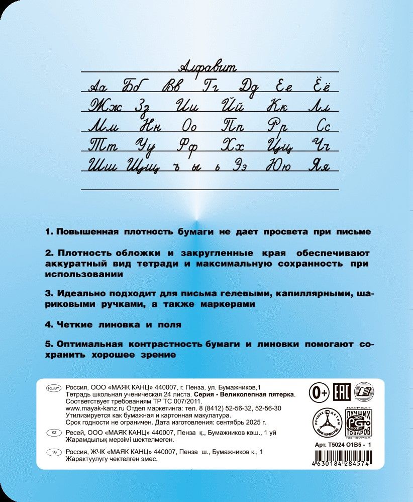 Формат: А5 Количество листов: 24 Тип крепления: скрепка Материал обложки: офсет Линовка: линия Вид бумаги внутреннего блока: офсет Мин. партия и варианты упаковок: 1 / 160 Тетрадь 24 л. линия Маяк Канц ВЕЛИКОЛЕПНАЯ ПЯТЕРКА офсет