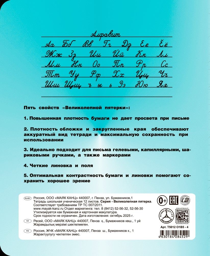 Формат: А5 Количество листов: 12 Тип крепления: скрепка Материал обложки: офсет Линовка: косая линия Вид бумаги внутреннего блока: офсет Мин. партия и варианты упаковок: 1 / 200 Тетрадь 12 л. косая линия Маяк Канц ВЕЛИКОЛЕПНАЯ ПЯТЕРКА офсет