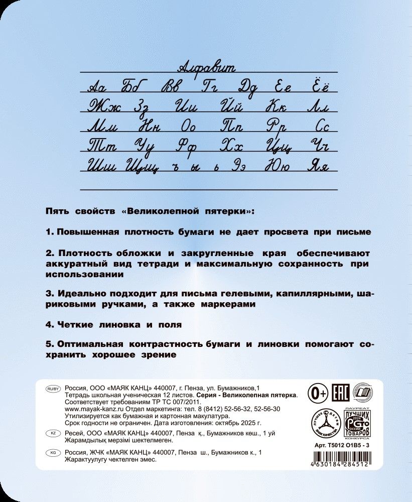 Формат: А5 Количество листов: 12 Тип крепления: скрепка Материал обложки: офсет Линовка: частая косая линия Вид бумаги внутреннего блока: офсет Мин. партия и варианты упаковок: 1 / 200 Тетрадь 12 л. частая косая линия Маяк Канц ВЕЛИКОЛЕПНАЯ ПЯТЕРКА офсет