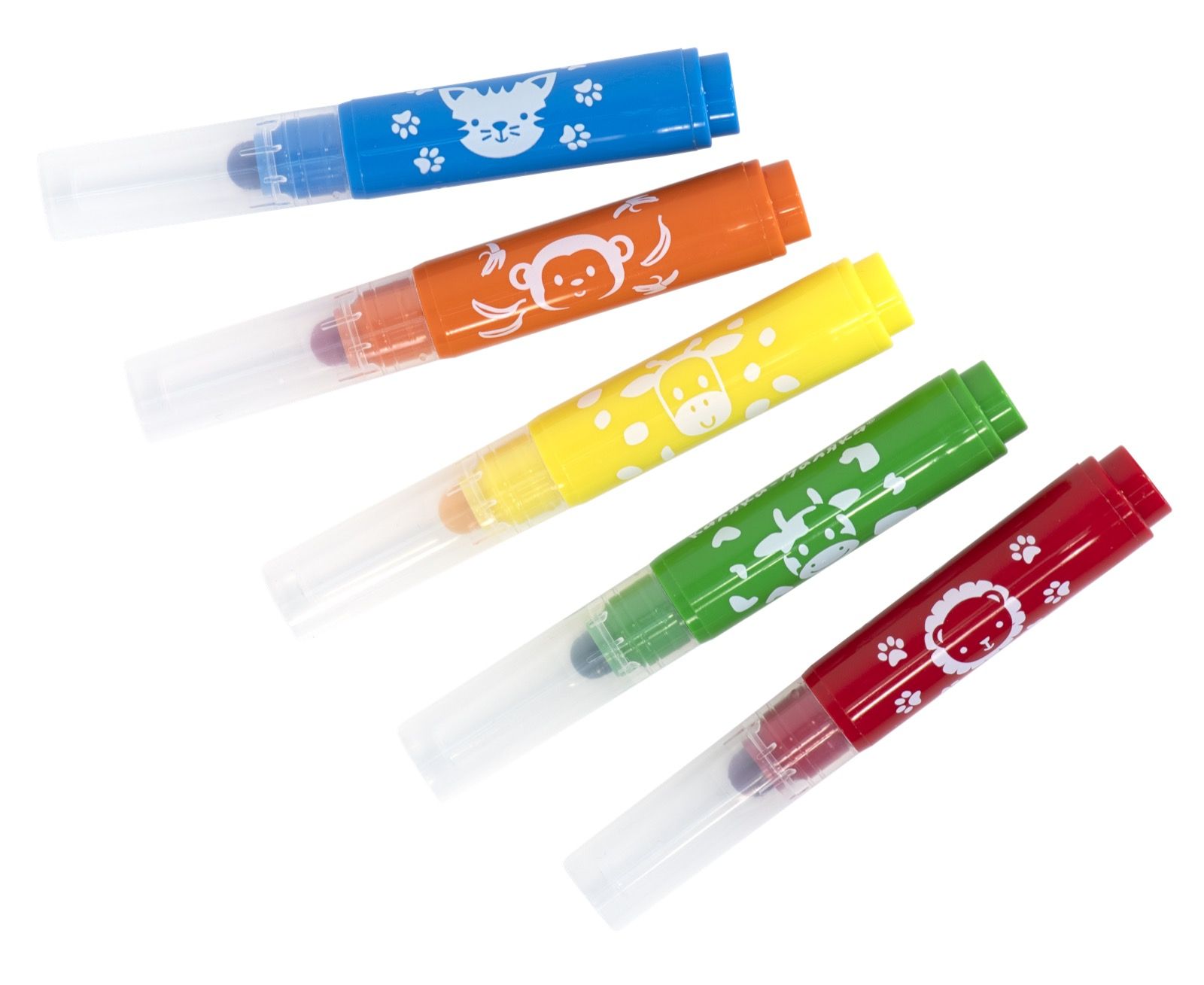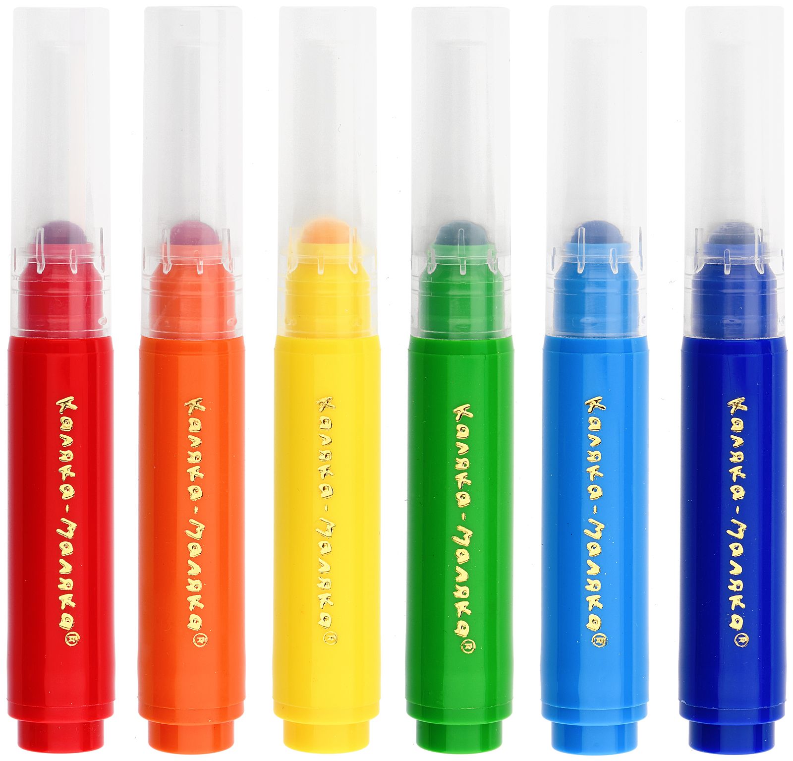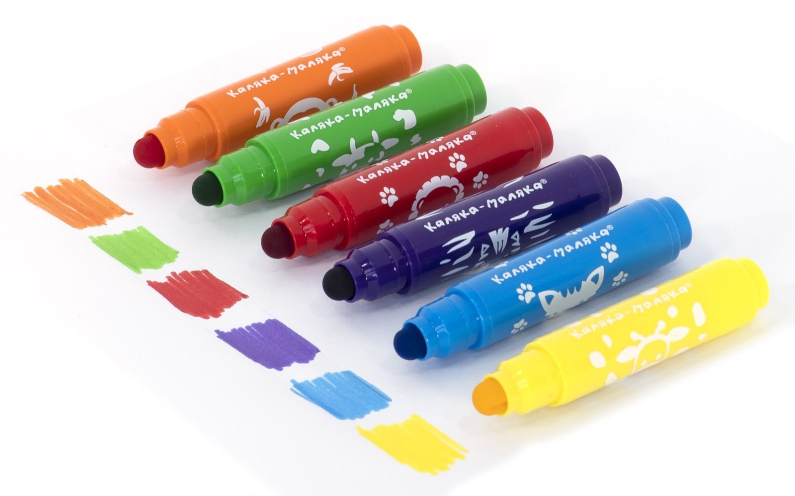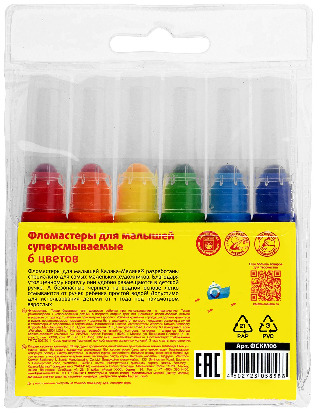 Фломастеры суперсмываемые для малышей Каляка-Маляка® одни из самых ярких, долговечных и безопасных фломастеров на рынке. Разработаны специально для самых маленьких детей в возрасте от 1 года.Фломастер имеет утолщённый корпус 15 мм, благодаря чему хорошо размещается в детской ручке, а также особый круглый пишущий наконечник диаметром 7,8 мм. Индивидуальный яркий принт на корпусе каждого фломастера привлечет внимание малыша и несомненно поможет увлечь его в мир творчества! Свежие следы фломастеров легко отстирываются с большинства тканей и смываются с кожи ребёнка простой водой! Выпускаются в удобном пластиковом блистере с европодвесом. В наборе 6 цветов.Фломастеры Каляка-Маляка® соответствуют самым высоким мировым стандартам качества и безопасности!Обладают яркими, сочными цветами. Богатая палитра оттенков.Полипропиленовый корпус обладает повышенной устойчивостью к излому, не образует острых краев при повреждении.Безопасный вентилируемый колпачок обеспечит свободное прохождение воздуха при случайном попадании в дыхательные пути.Прочный пишущий узел не деформируется и не продавливается.Чернила на водной основе.