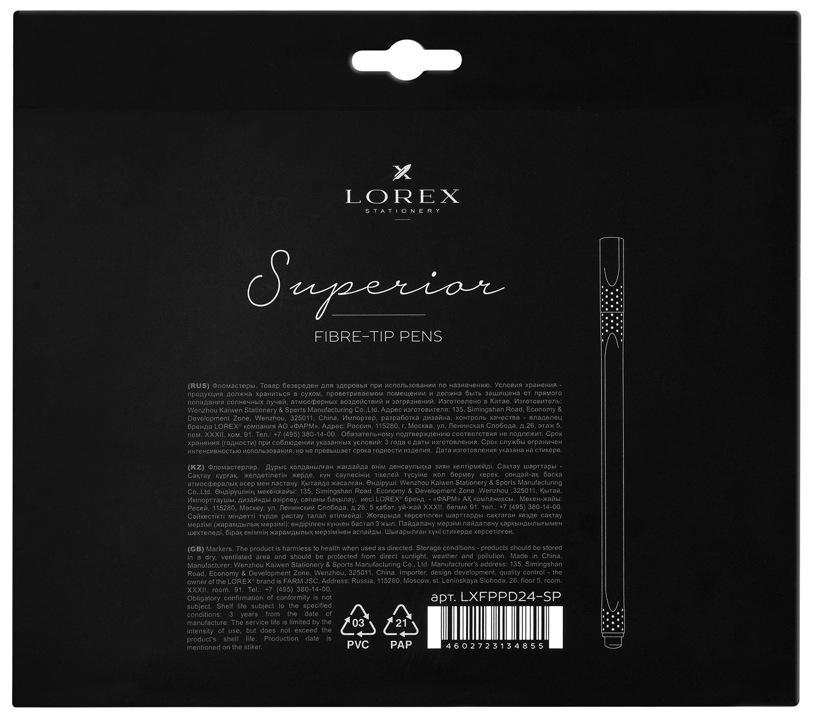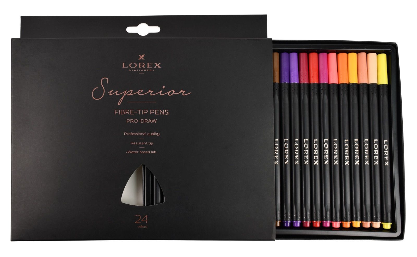 Все товары коллекции: SUPERIORВсе коллекции LorexЯркие и непохожие на всех – фломастеры LOREX! Они перевернут классическое представление о фломастерах.Ваш взгляд не сможет оторваться от новой коллекции фломастеров LOREX PRO-DRAW SUPERIOR. Абсолютно черная матовая упаковка с фольгой цвета розового золота – мы готовы удивлять!Упаковка имеет двойной трей, который выдвигается сбоку. Это очень удобно – фломастеры лежат аккуратно, а все цвета видно сразу. У фломастеров нет шанса потеряться.Лаконичный тонкий корпус, удобный захват и тонкий наконечник помогут создавать точные детальные рисунки. Качественные чернила на водной основе безопасны и прослужат долгое время.Серия представлена наборами в двух цветностях: 12 и 24 цвета.