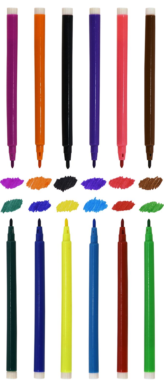 Фломастеры с вентилируемым колпачком. Изготовлены из полипропилена, не высыхают до 5 лет.Основные характеристики:Волокнистый наконечник диаметром 1,8 мм. Толщина линии 1 мм.Безопасные для здоровья человека чернила, которые легко отстирываются с одежды. Вентилируемый колпачок.Цилиндрический пишущий узел, устойчивый к вдавливанию.
