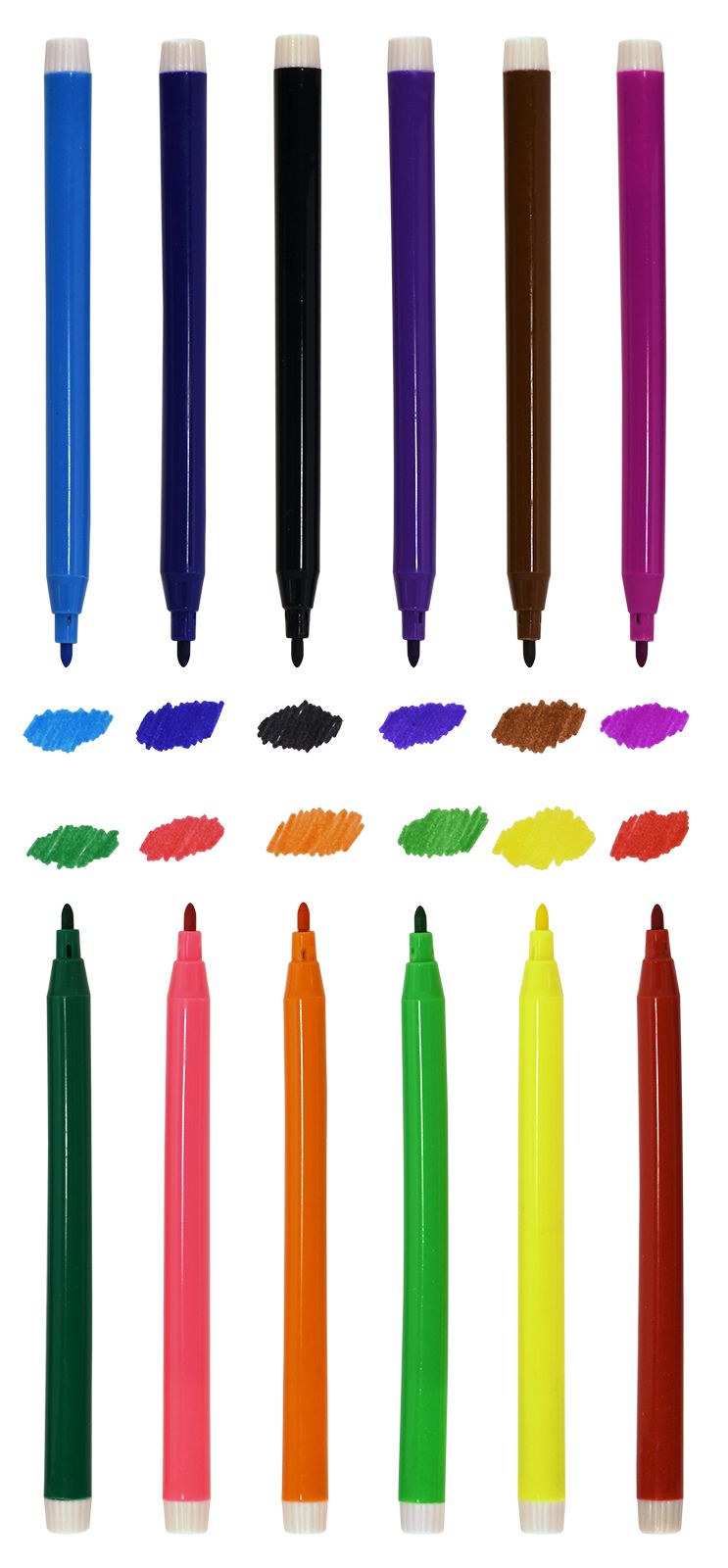 Фломастеры с вентилируемым колпачком. Изготовлены из полипропилена, не высыхают до 5 лет.Основные характеристики:Волокнистый наконечник диаметром 1,8 мм. Толщина линии 1 мм. Безопасные для здоровья человека чернила, которые легко отстирываются с одежды.Вентилируемый колпачок.Цилиндрический пишущий узел, устойчивый к вдавливанию.