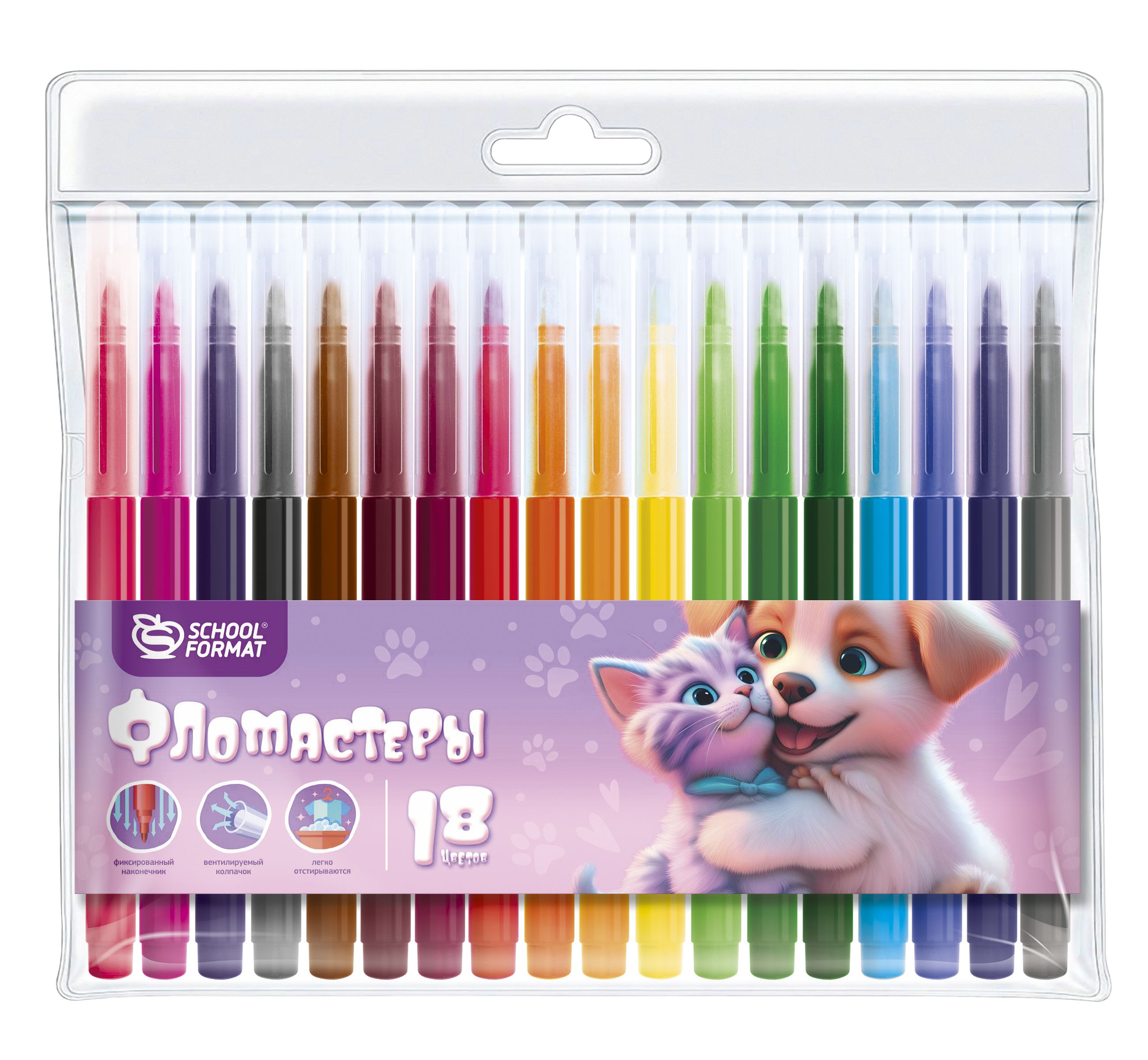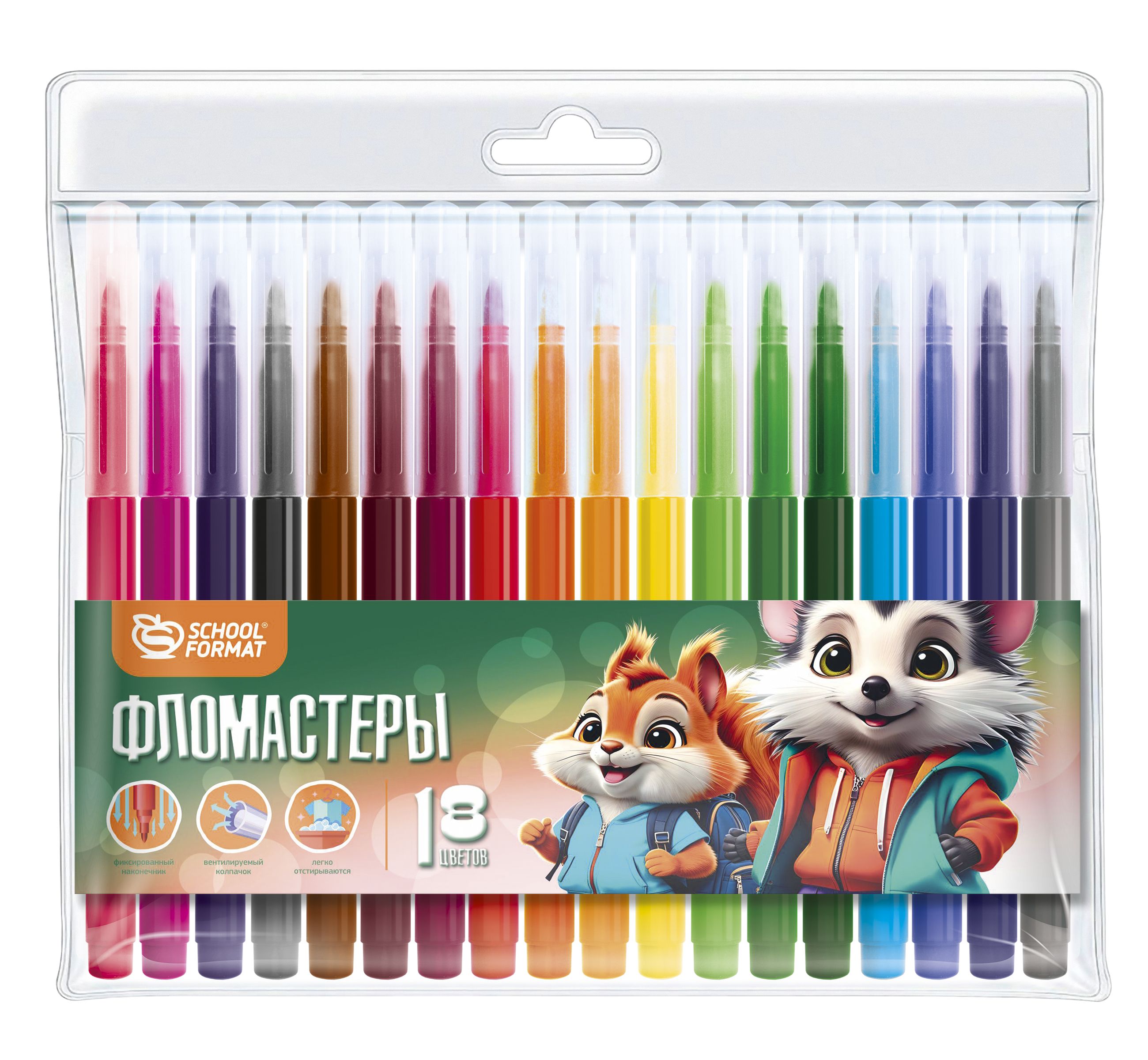 Количество цветов: 18 Наличие европодвеса: Да Форма наконечника: конический Тип фломастеров: классические Вид товара: Фломастеры Возраст: от 3 лет Мин. партия и варианты упаковок: 1 / 24 / 144 Фломастеры Schoolformat ЯРКИЕ ЗВЕРЯТА классические 18 цв. круглый корпус, смываемые, блистер