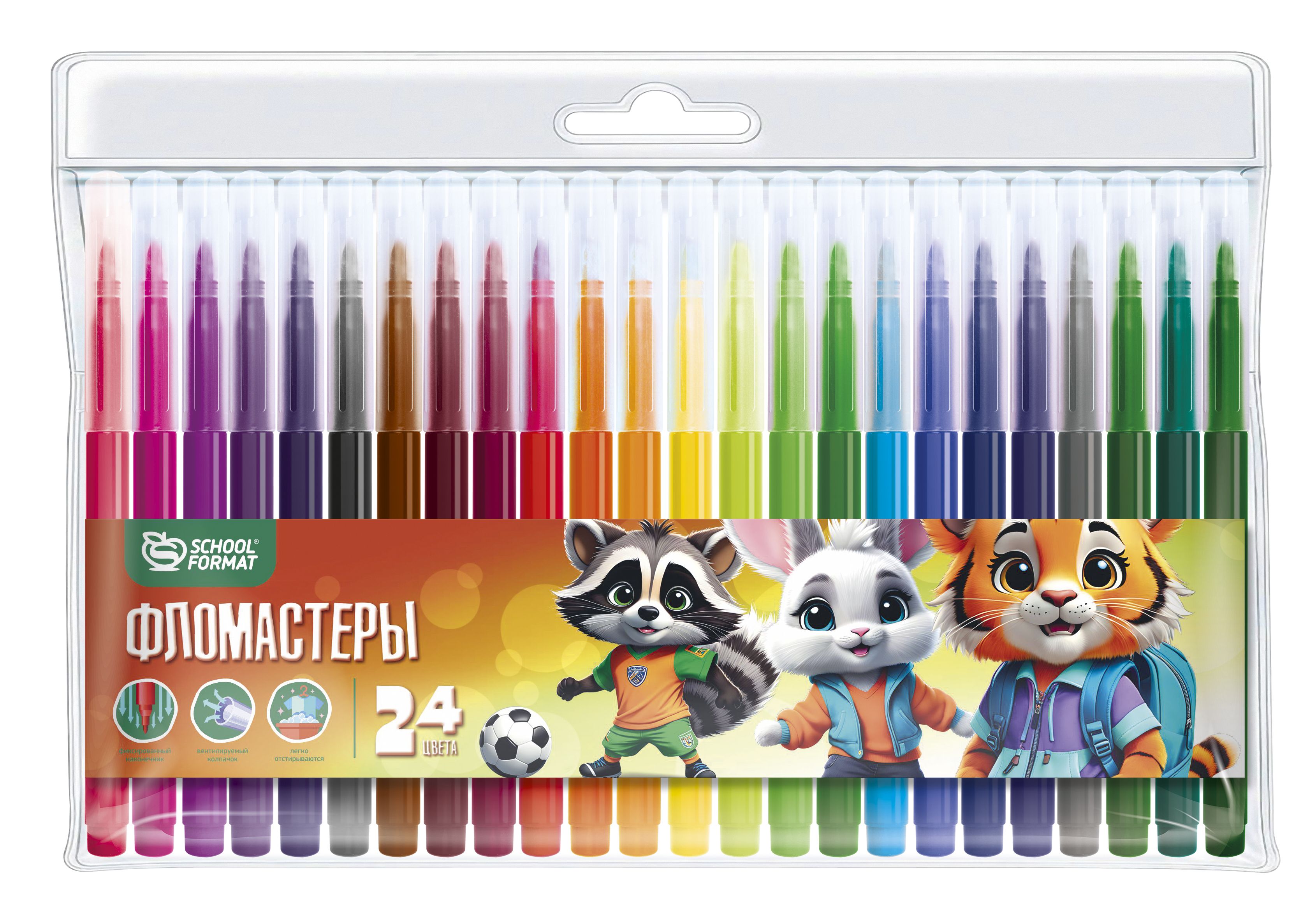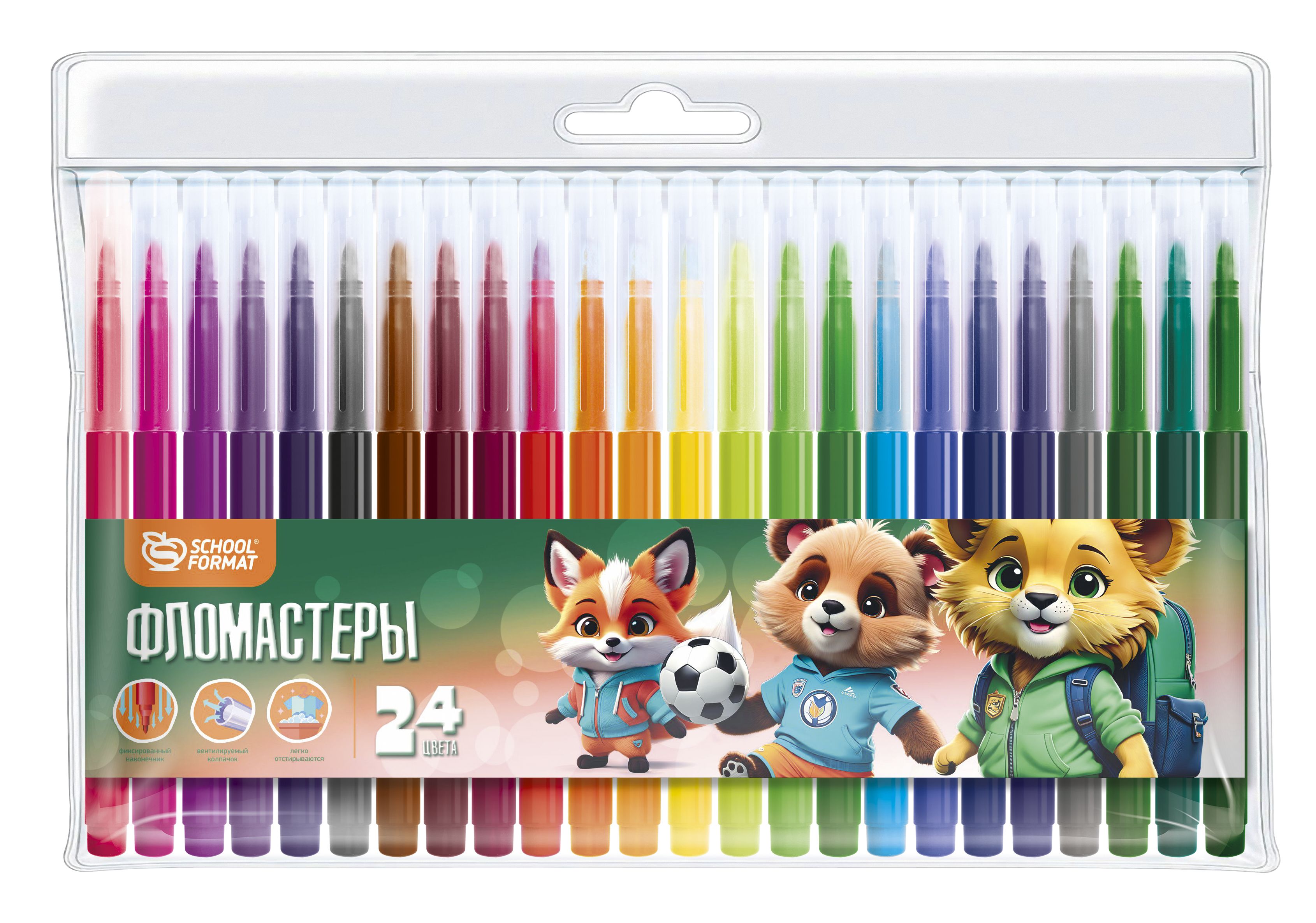 Количество цветов: 24 Наличие европодвеса: Да Форма наконечника: конический Тип фломастеров: классические Вид товара: Фломастеры Возраст: от 3 лет Мин. партия и варианты упаковок: 1 / 24 / 96 Фломастеры Schoolformat ЯРКИЕ ЗВЕРЯТА классические 24 цв. круглый корпус, смываемые, блистер