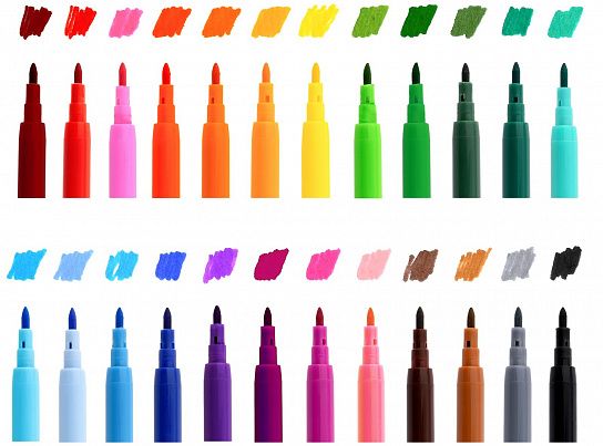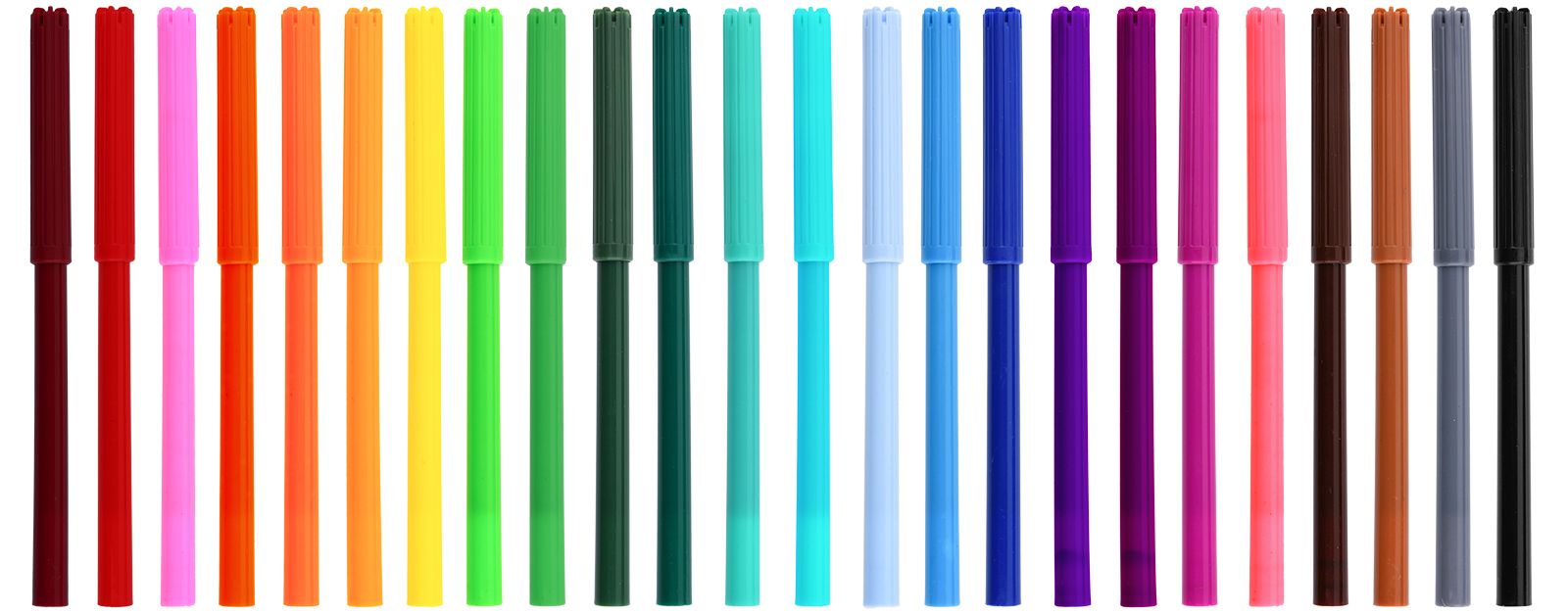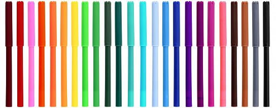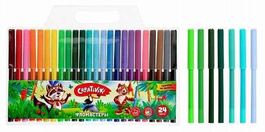 Яркие и насыщенные фломастеры – 24 цветов. Маленькие креативики в процессе рисования раскрывают творческий потенциал, учатся аккуратности, усидчивости, а весёлая игра на обороте развивает внимательность. Изготовлены из хорошего пластика, оснащены вентилируемым колпачком, согласно нормам безопасности, и легко отстирываются с одежды.Диаметр корпуса – 8 мм, размер с колпачком – 133 мм.