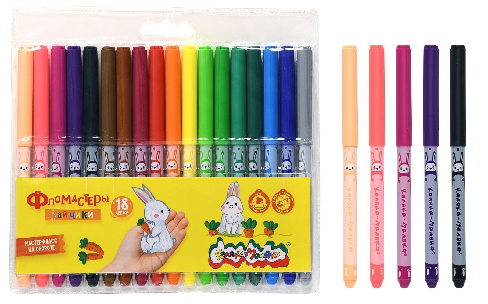 Фломастеры Каляка-Маляка® одни из самых ярких, долговечных и безопасных фломастеров на рынке. Разработаны для детей в возрасте от 3 лет. Весёлые зайчики на корпусе привлекут внимание ребенка и несомненно помогут увлечь его в мир творчества!