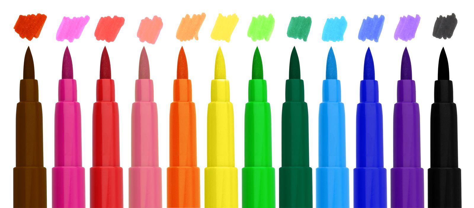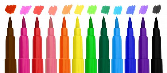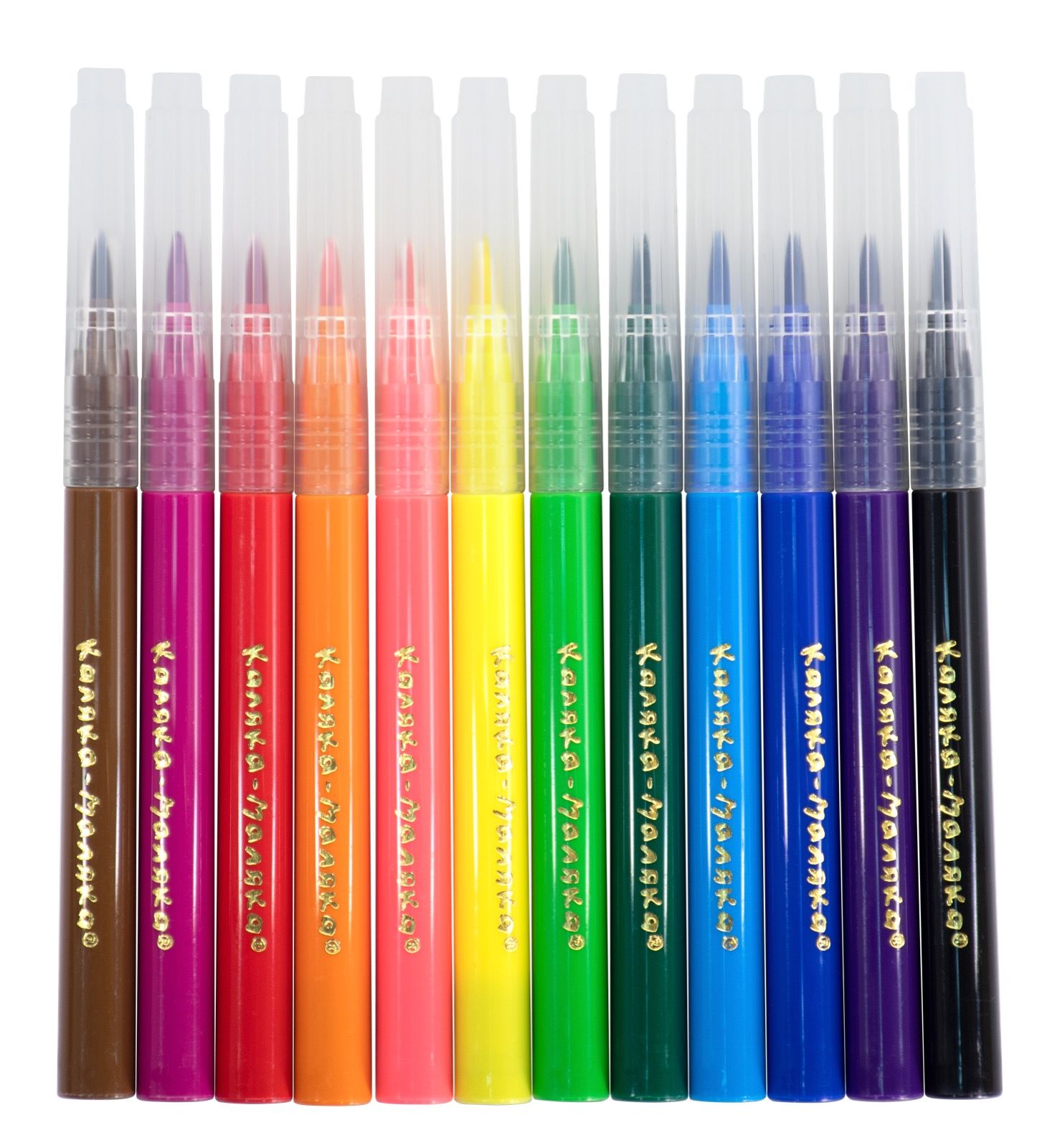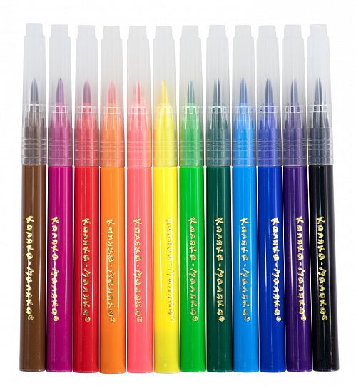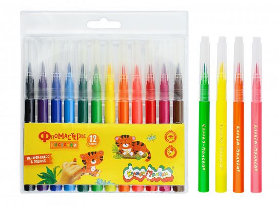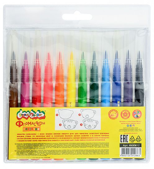 Фломастеры-кисточки Каляка-Маляка® одни из самых ярких, долговечных и безопасных фломастеров на рынке. Разработаны для детей в возрасте от 3 лет. Фломастеры-кисточки Каляка-Маляка® имитируют художественную кисть: наконечник в форме кисточки оставляет характерный след. Выпускаются в удобном пластиковом блистере с европодвесом. Утолщённый корпус фломастера 10 мм. Диаметр пишущего наконечника 3,5 мм. Толщина линии зависит от силы нажатия на фломастер. В наборе 12 цветов.