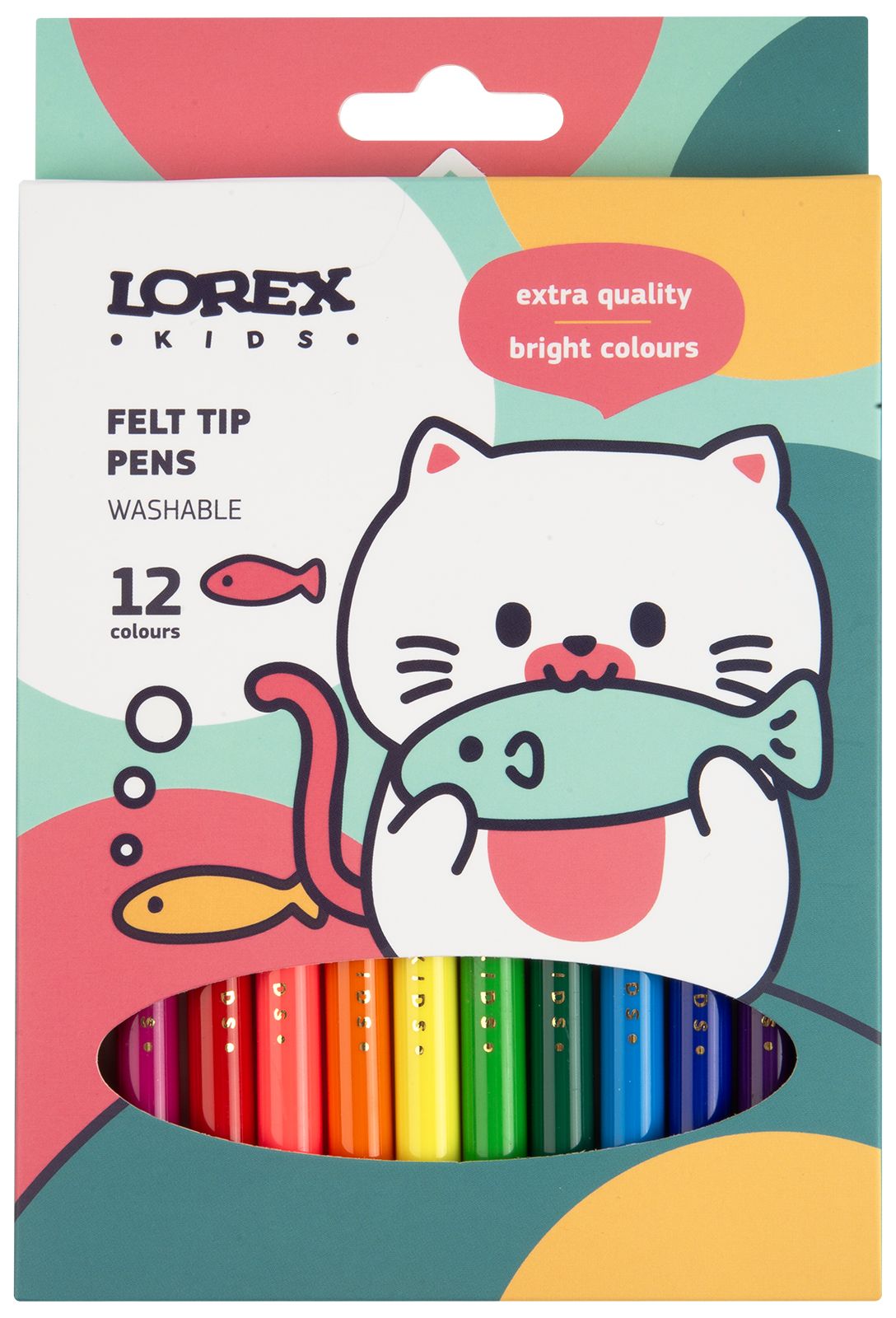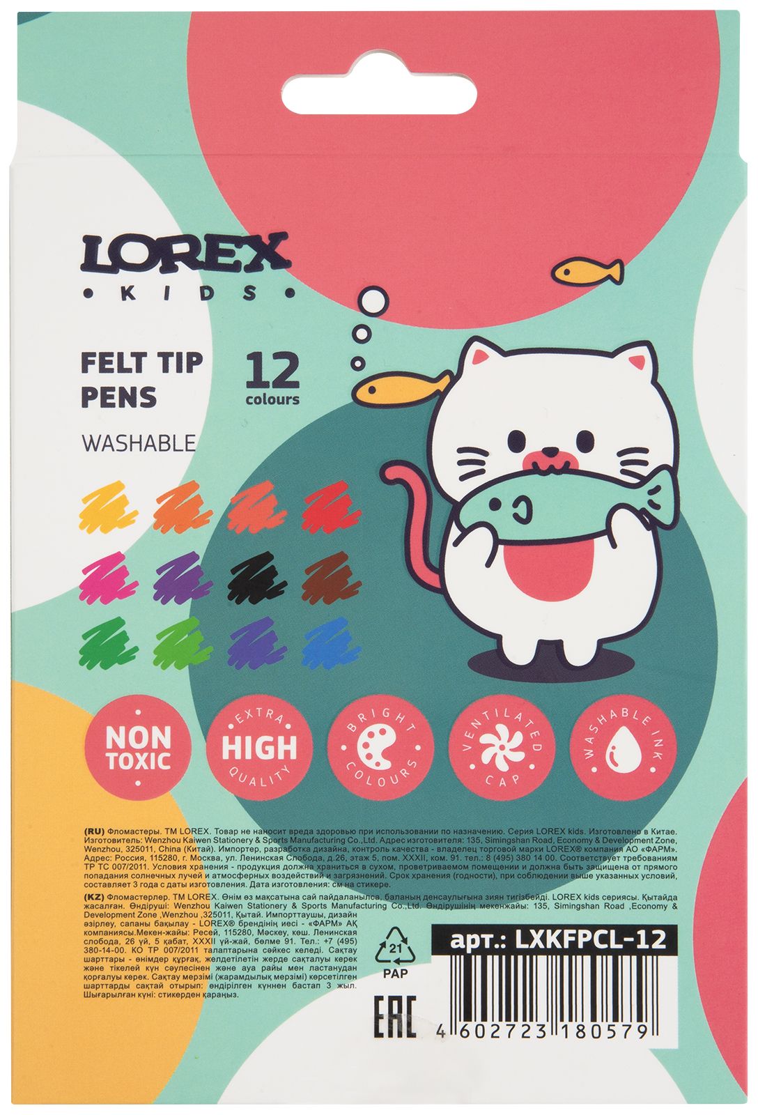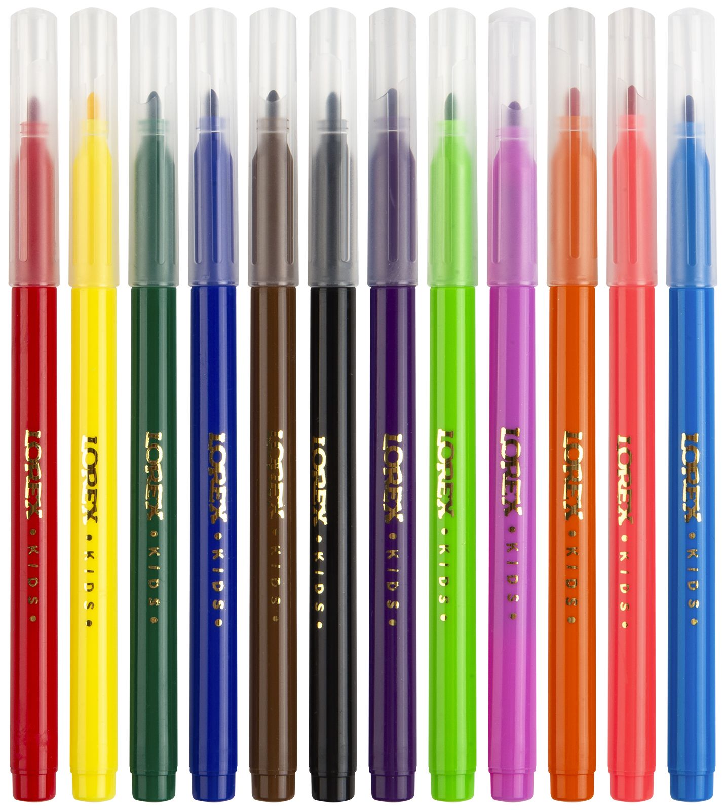 Фломастеры LOREX KIDS разработаны для детей в возрасте от 3 до 10 лет. Вентилируемые колпачки изготовлены в соответствии с международными стандартами, что обеспечивает безопасность использования продукции даже самыми маленькими детьми. Выпускаются в картонной упаковке с европодвесом. Фломастер имеет удобный трехгранный захват, который способствует правильному положению пальцев на корпусе. Толщина кончика увеличенная – 3 мм. Поэтому линия получается толстой, поверхность быстро закрашивается. В наборе 12 цветов. На каждый фломастер нанесено тиснение золотой фольгой с логотипом LOREX KIDS.
