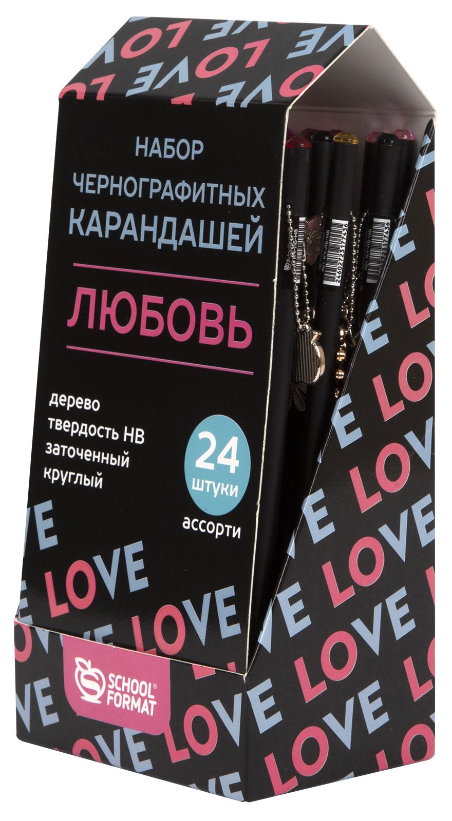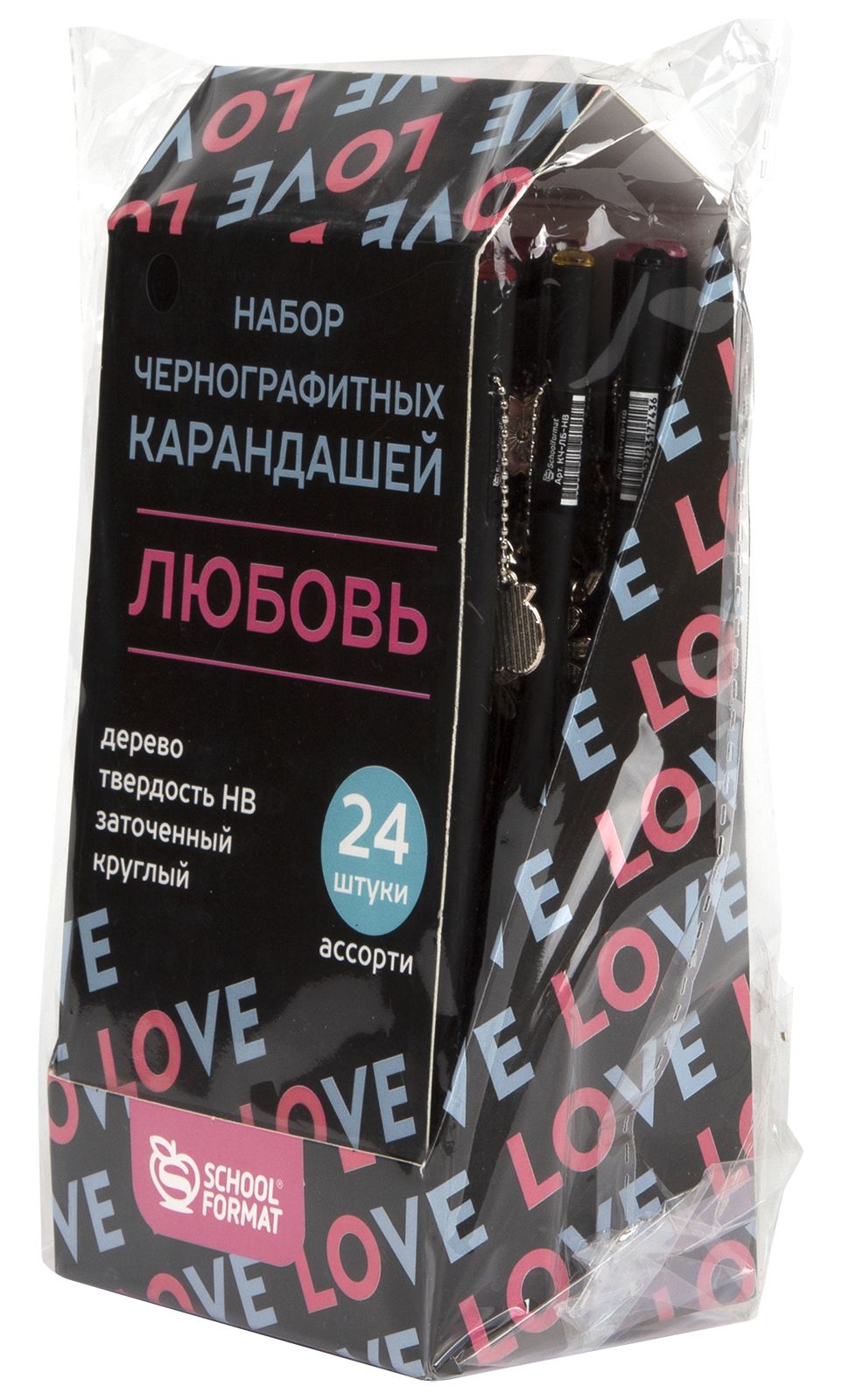 Наличие европодвеса: Нет Мягкость грифеля: НВ Цвет корпуса: черный Наличие индивидуального штрих-кода: Да Заточенный: Да Форма корпуса: круглый Мин. партия и варианты упаковок: 1 / 24 / 720 Карандаш чернографитный деревянный Schoolformat ЛЮБОВЬ НВ заточенный, круглый, с подвеской, дисплей