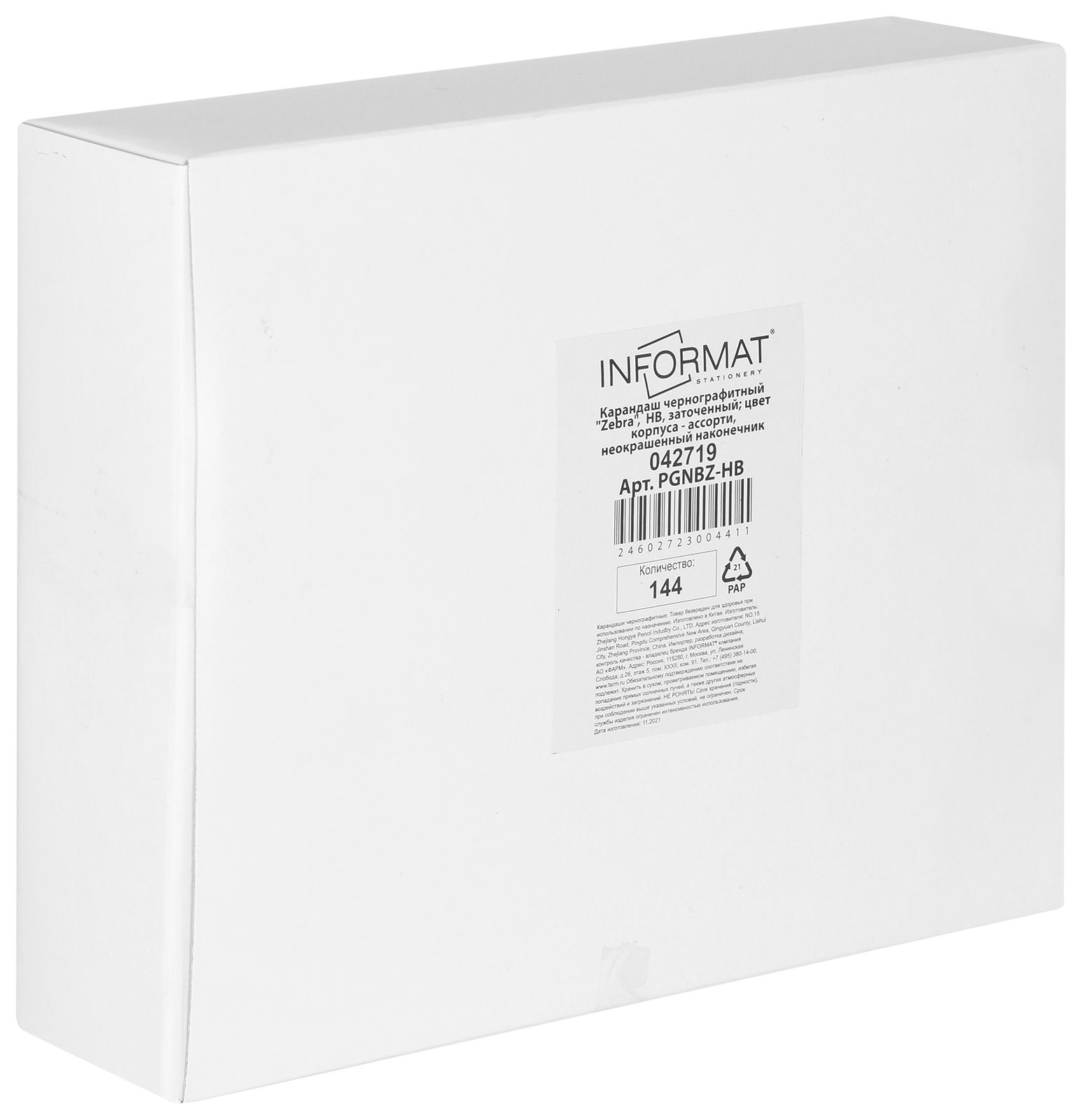 Наличие европодвеса: Нет Мягкость грифеля: НВ Цвет корпуса: ассорти Наличие индивидуального штрих-кода: Да Заточенный: Да Форма корпуса: шестигранный Мин. партия и варианты упаковок: 1 / 144 / 2880 Карандаш чернографитный деревянный INFORMAT Zebra НВ заточенный, шестигранный, картонная коробка