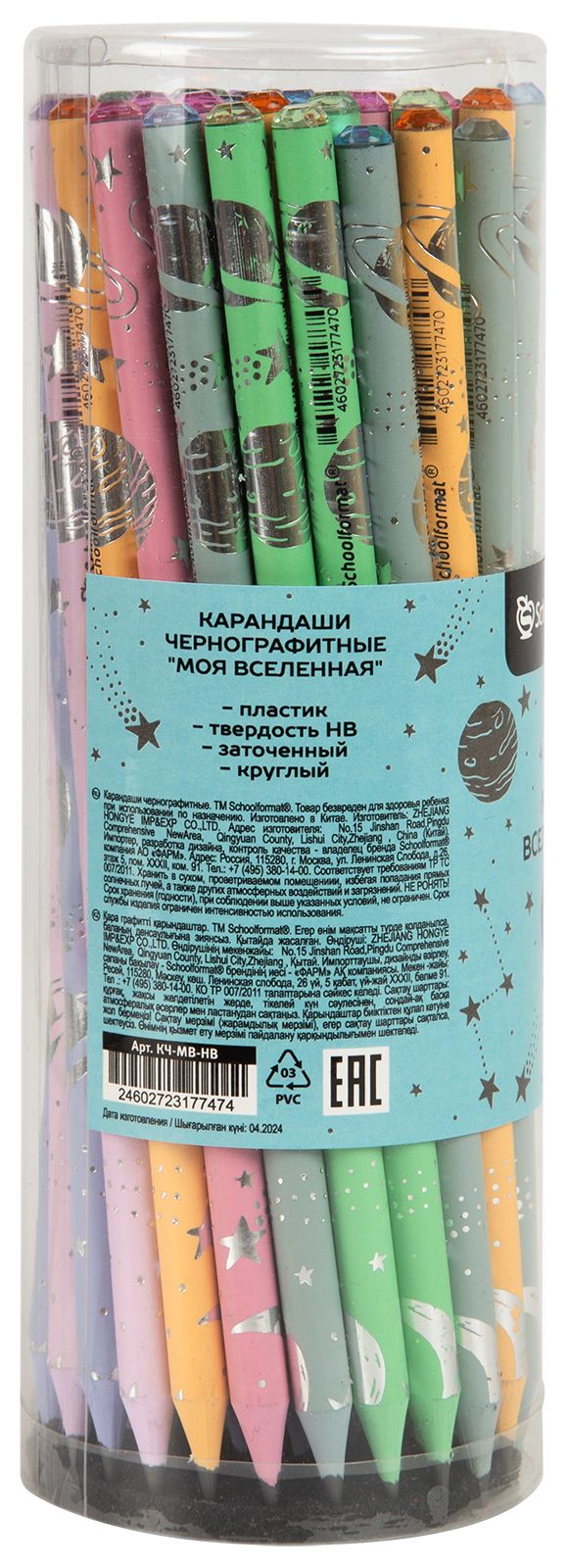 Наличие европодвеса: Нет Мягкость грифеля: НВ Цвет корпуса: ассорти Наличие индивидуального штрих-кода: Да Заточенный: Да Форма корпуса: круглый Мин. партия и варианты упаковок: 1 / 48 / 576 / 2304 Карандаш чернографитный пластиковый Schoolformat МОЯ ВСЕЛЕННАЯ НВ заточенный, круглый, тонированный корпус, фольга, со стразом, тубус